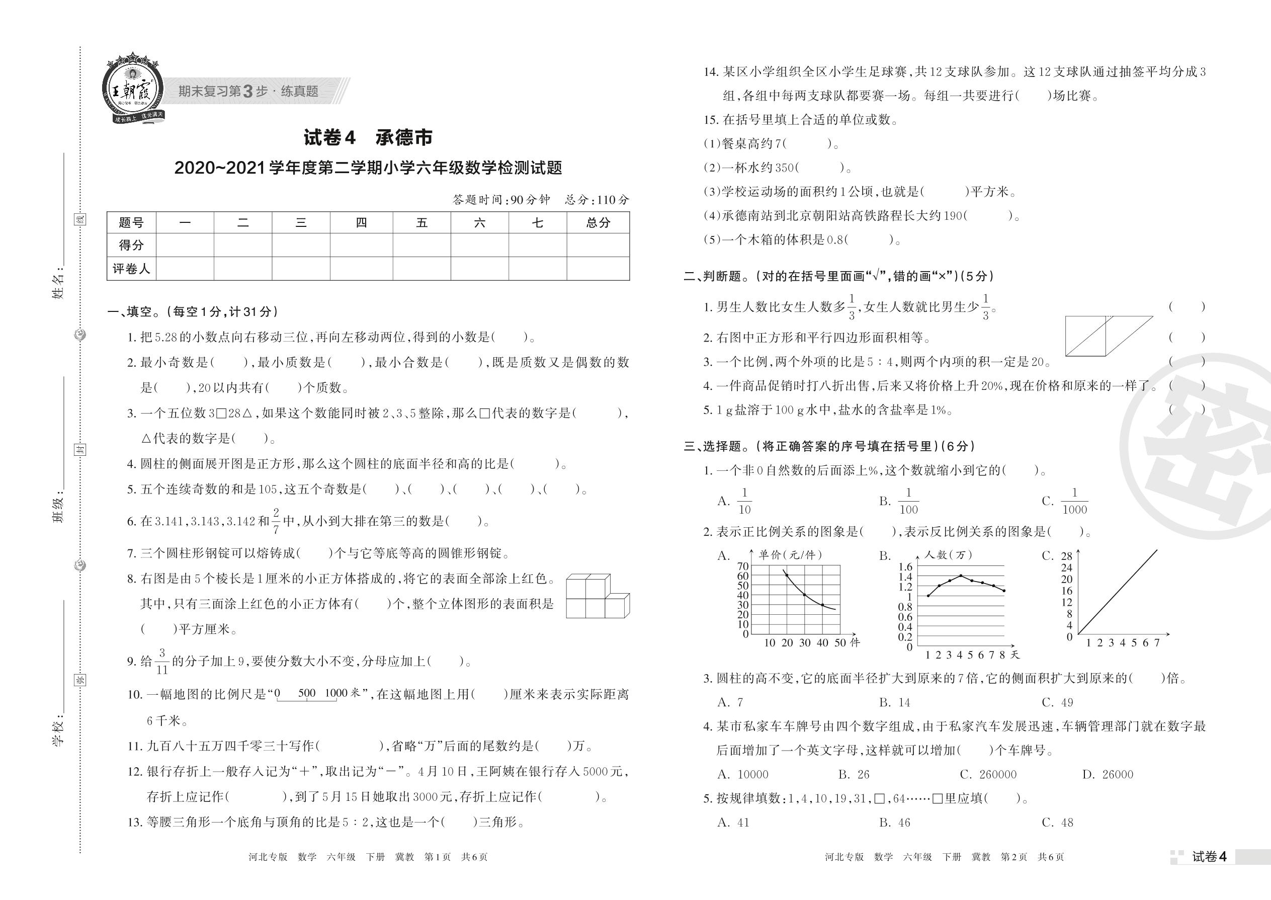 承德市2020~2021学年度第二学期小学六年级数学检测试题(冀教版)【4】