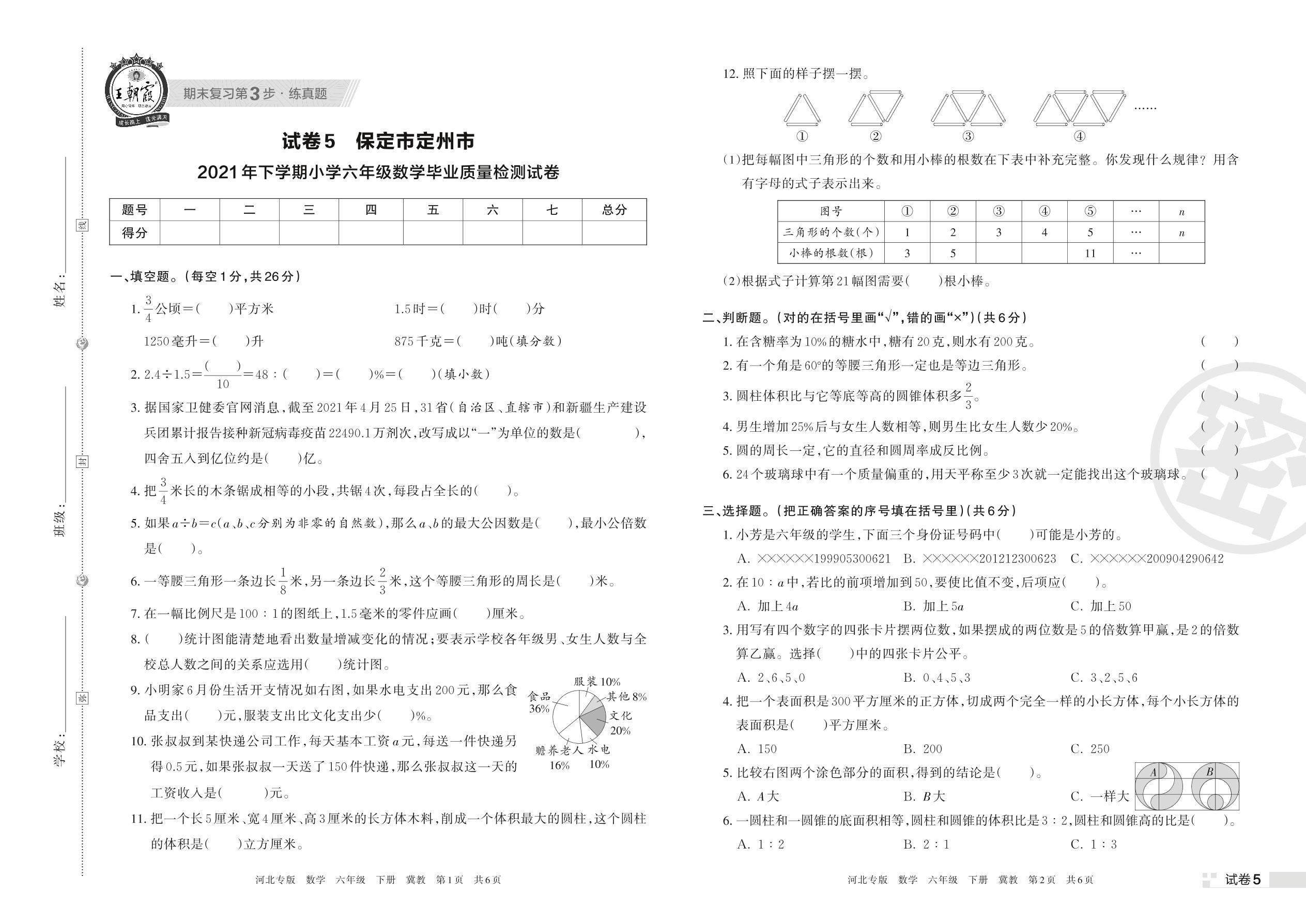 保定市定州市2021年下学期小学六年级数学毕业质量检测试卷(冀教版)【5】