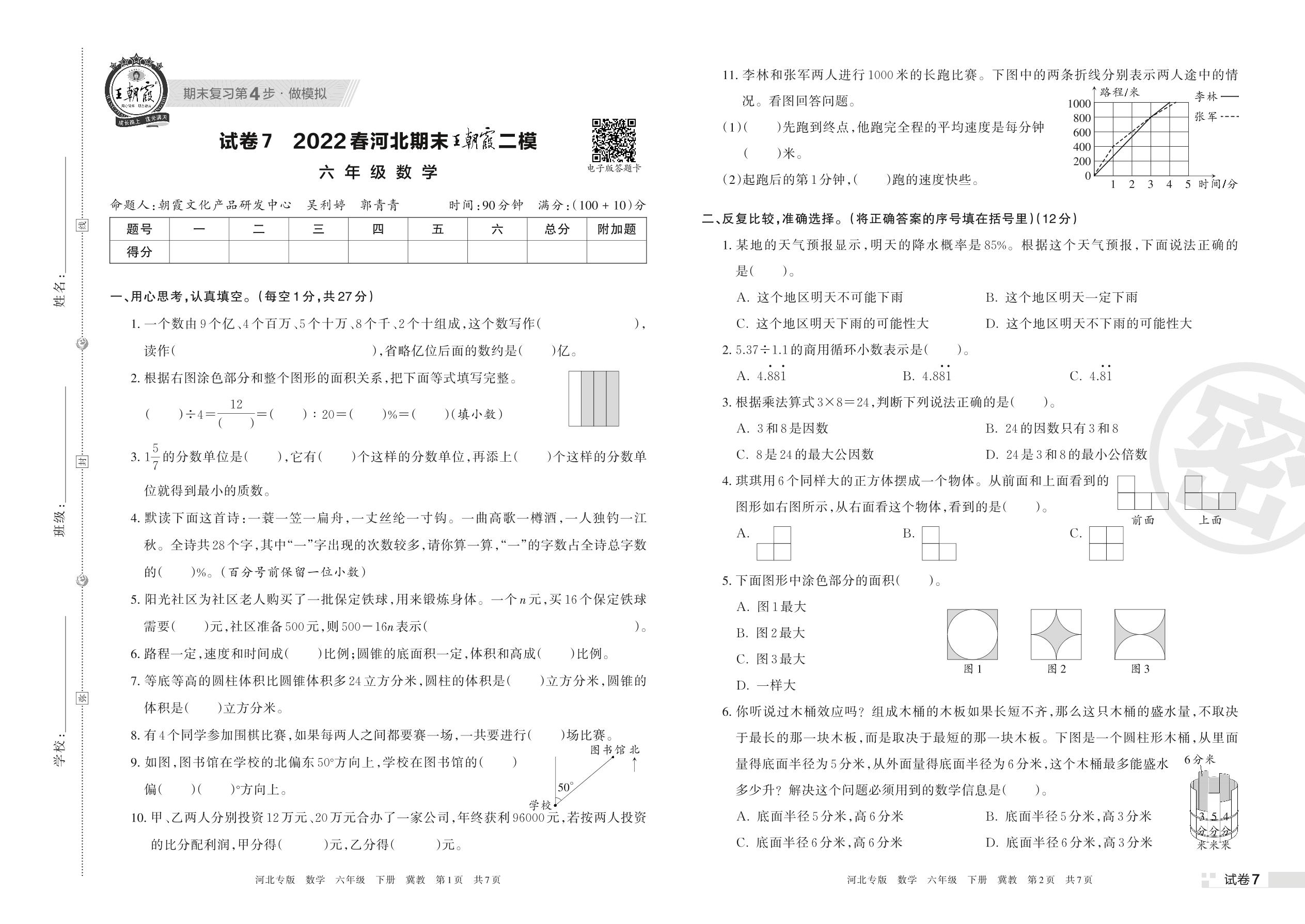 王朝霞期末模拟卷六年级下册数学(冀教版)【7】