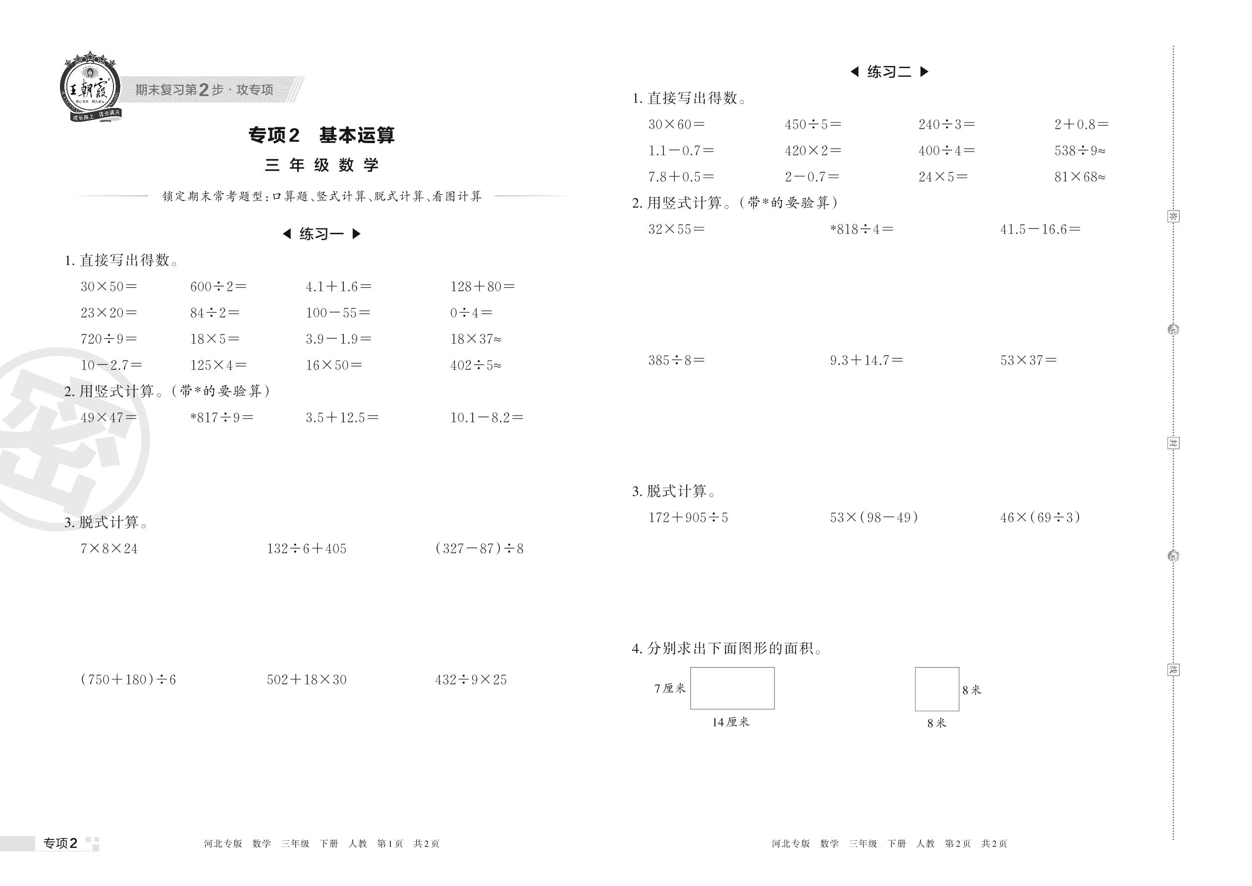 王朝霞期末专项卷——基本运算三年级下册数学(人教版)【2】
