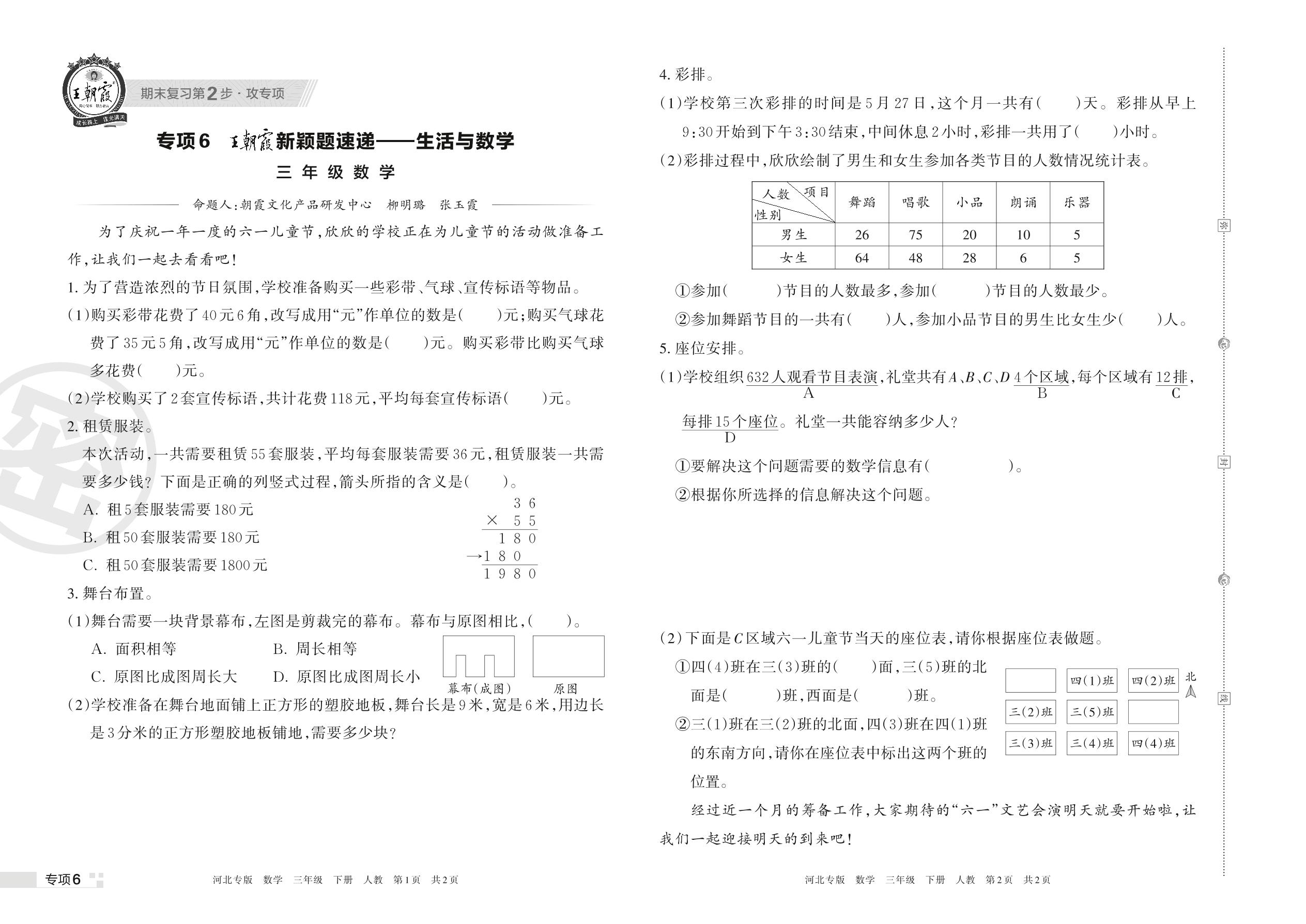 王朝霞期末专项卷——新颖题速递:生活与数学三年级下册数学(人教版)【6】