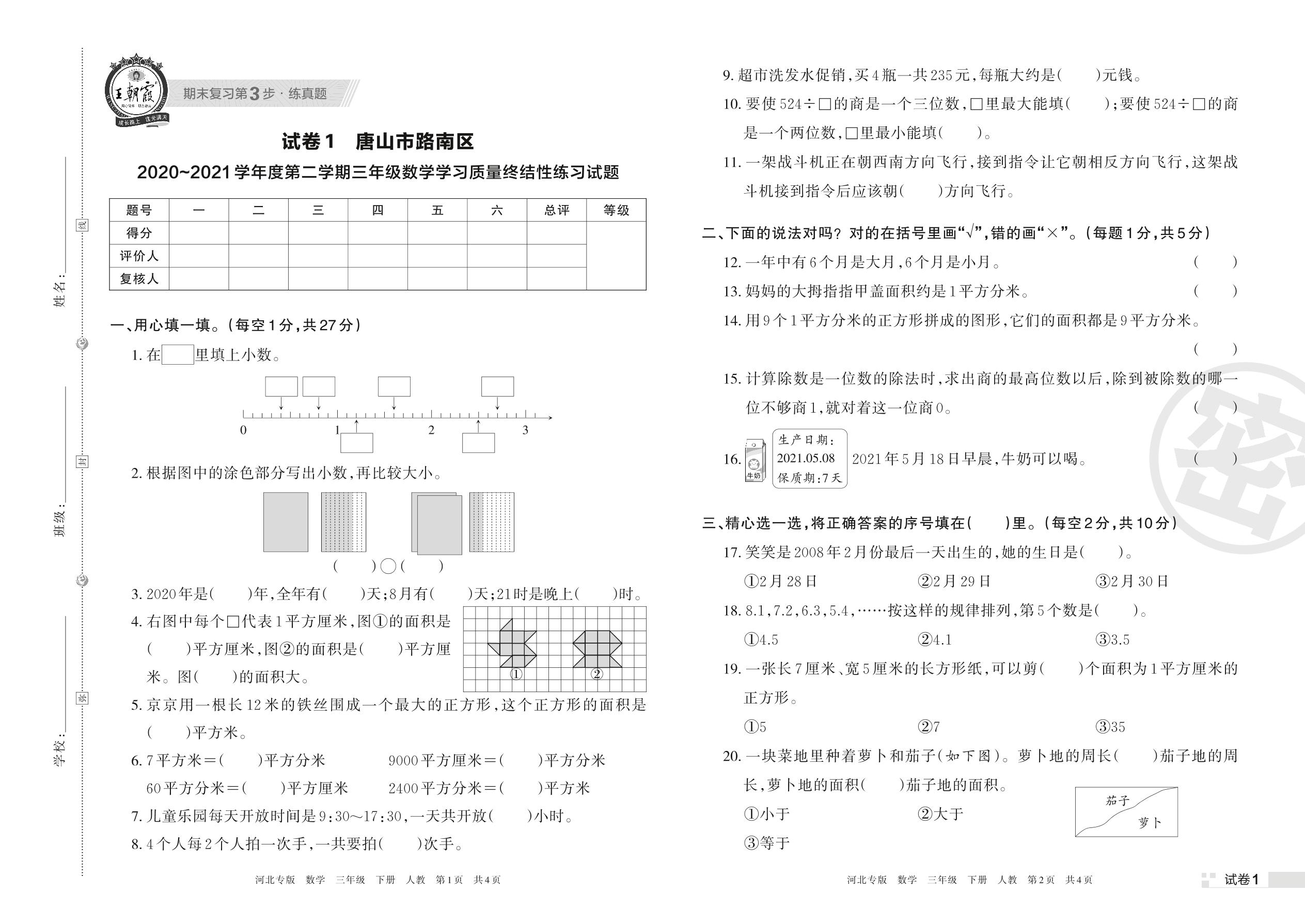 唐山市路南区2020~2021学年度第二学期三年级数学学习质量终结性练习试题(人教版)【1】