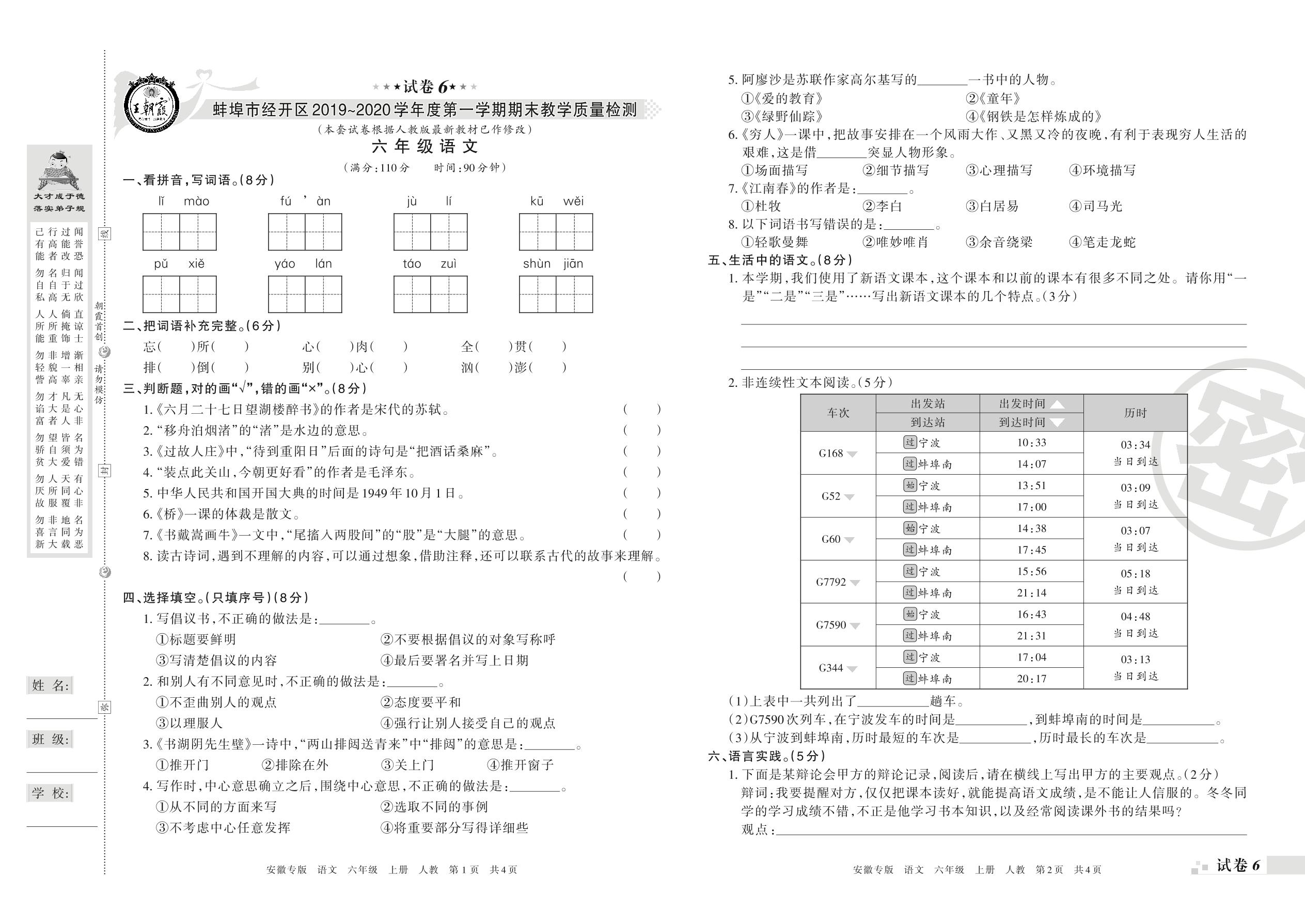 2019-2020学年第一学期蚌埠市经开区六年级语文试卷(人教版)【6】