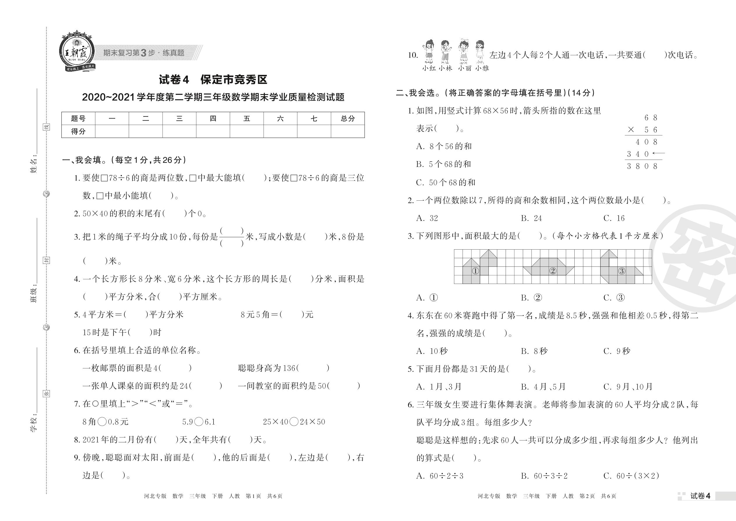 保定市竞秀区2020~2021学年度第二学期三年级数学期末学业质量检测试题(人教版)【4】