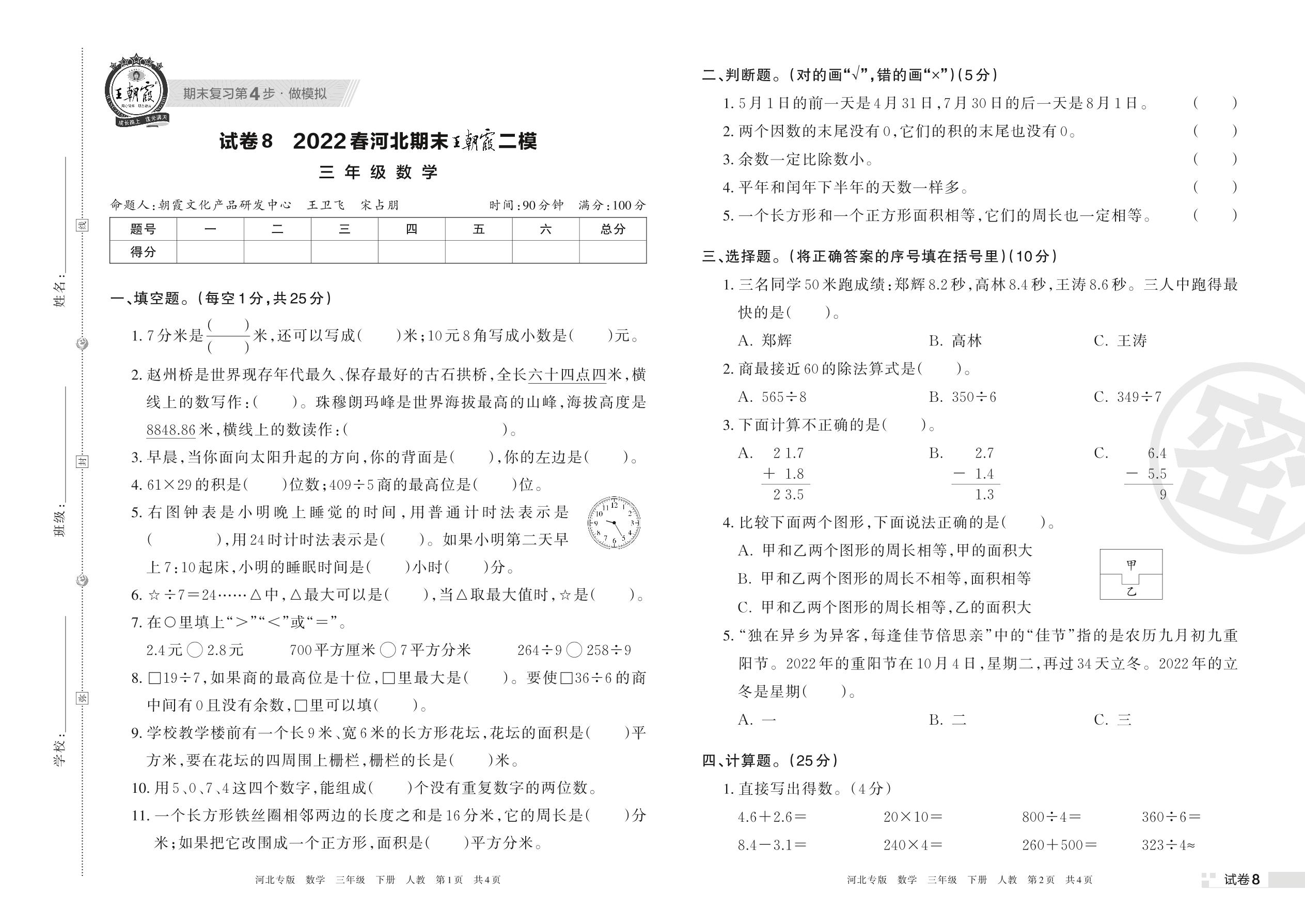 王朝霞期末模拟卷三年级下册数学(人教版)【8】