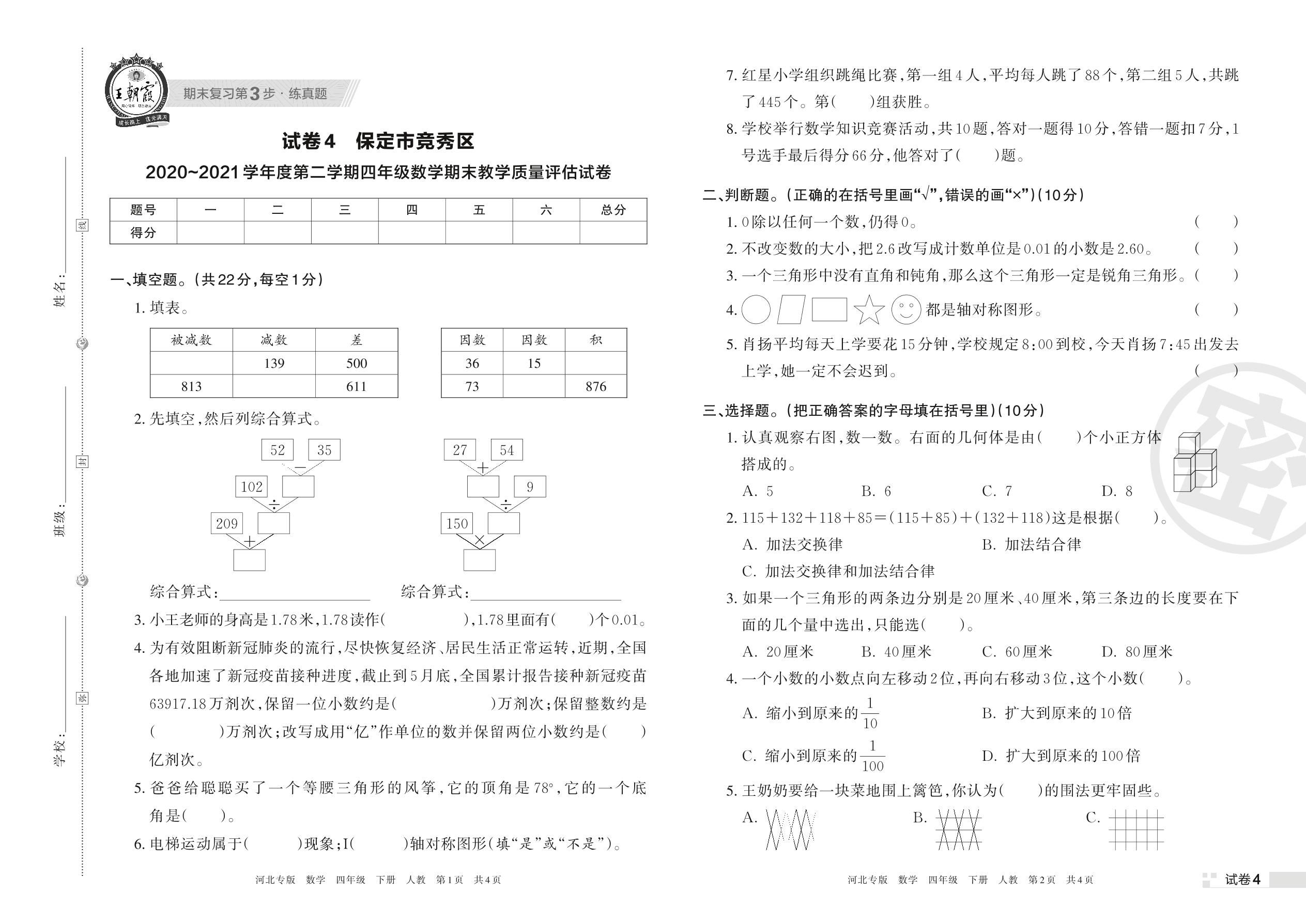 保定市竞秀区2020~2021学年度第二学期四年级数学期末教学质量评估试卷(人教版)【4】