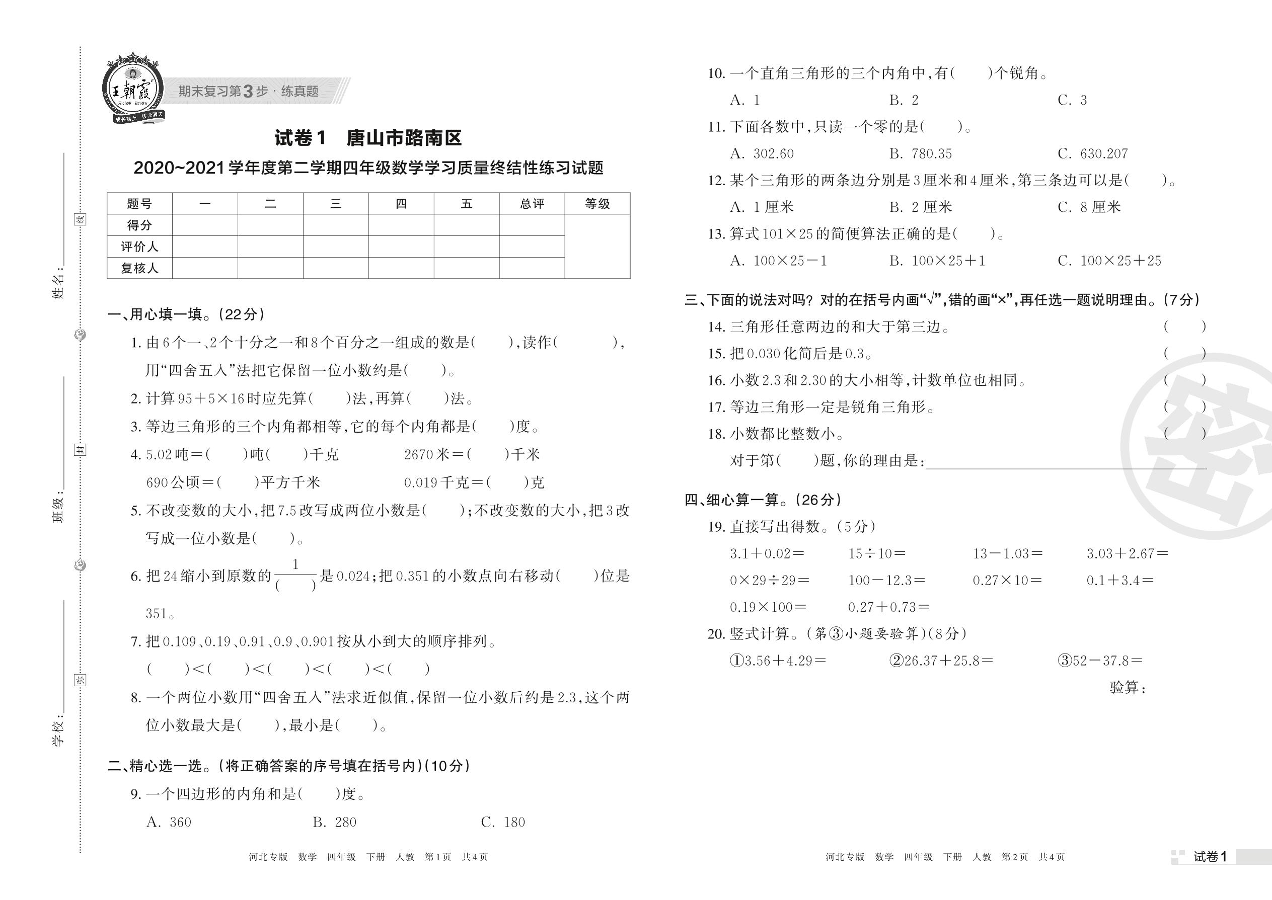 唐山市路南区2020~2021学年度第二学期四年级数学学习质量终结性练习试题(人教版)【1】