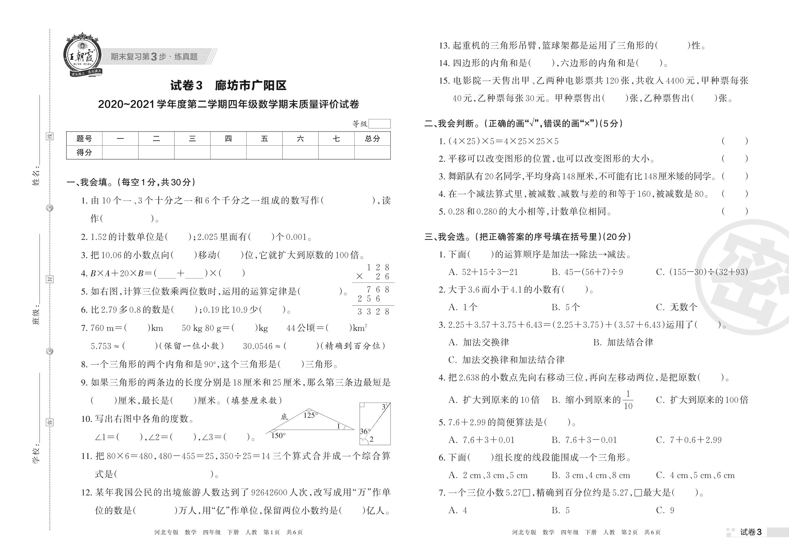 廊坊市广阳区2020~2021学年度第二学期四年级数学期末质量评价试卷(人教版)【3】