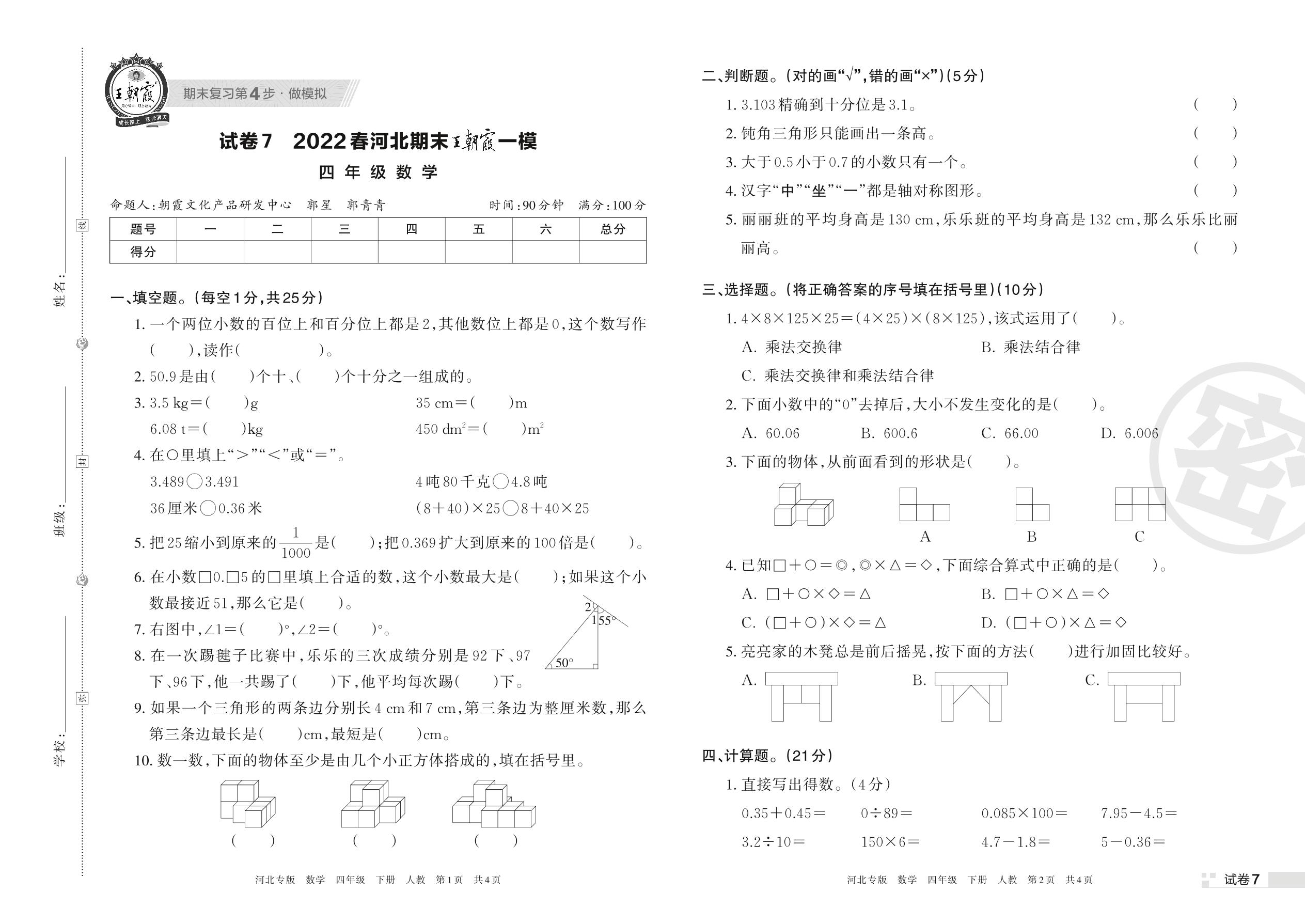 王朝霞期末模拟卷四年级下册数学(人教版)【7】