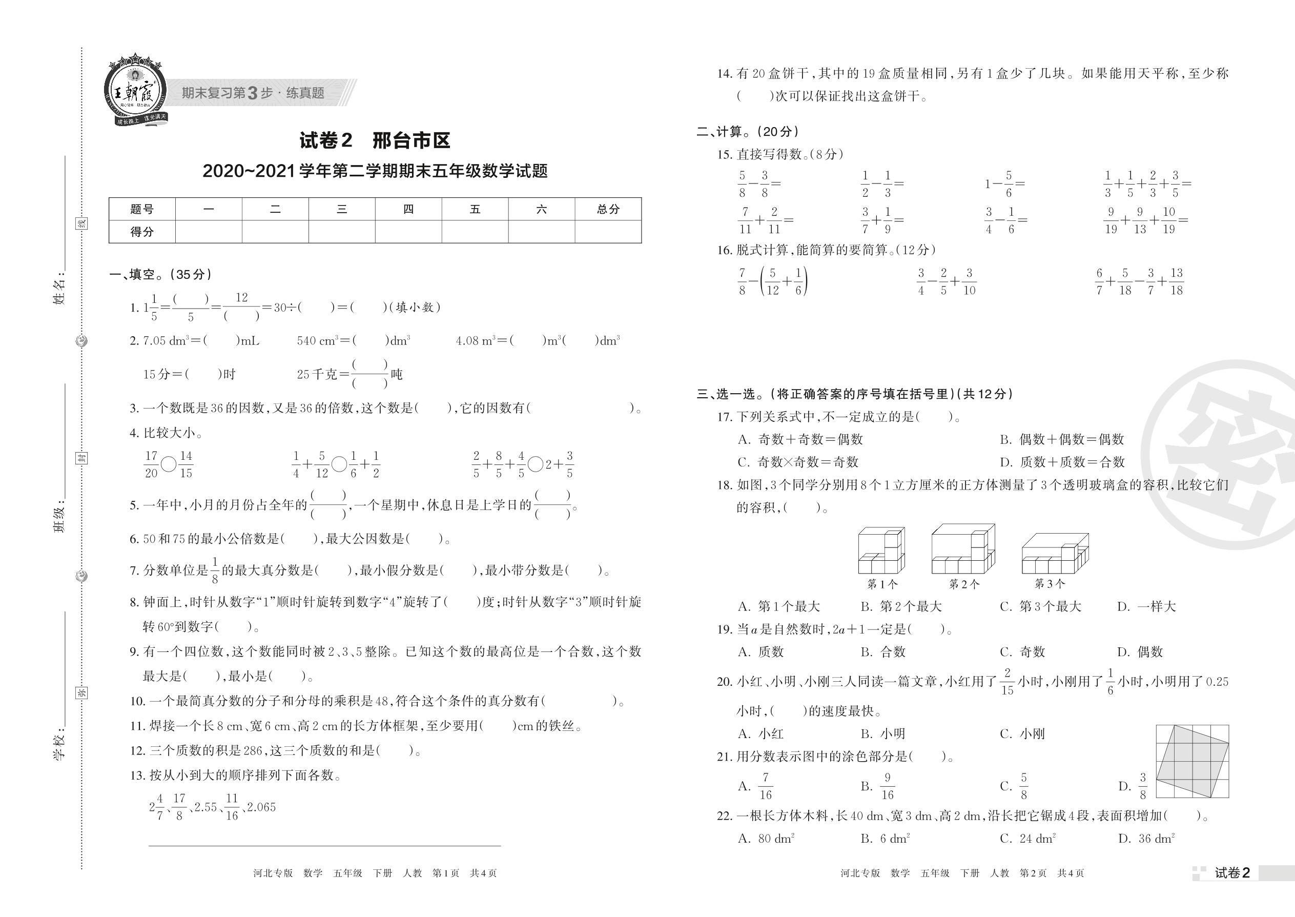 邢台市区2020~2021学年第二学期期末五年级数学试题(人教版)【2】