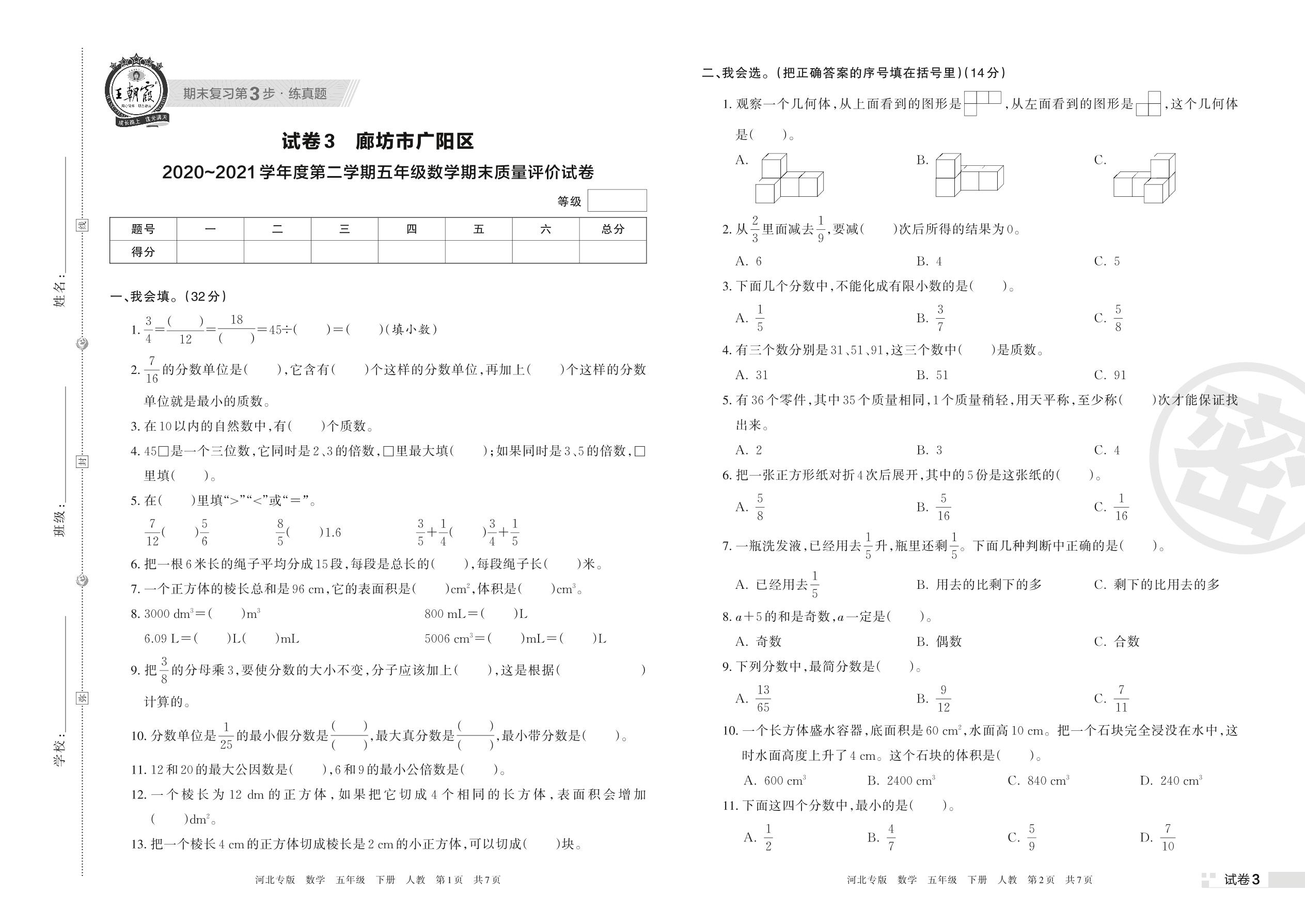 廊坊市广阳区2020~2021学年度第二学期五年级数学期末质量评价试卷(人教版)【3】