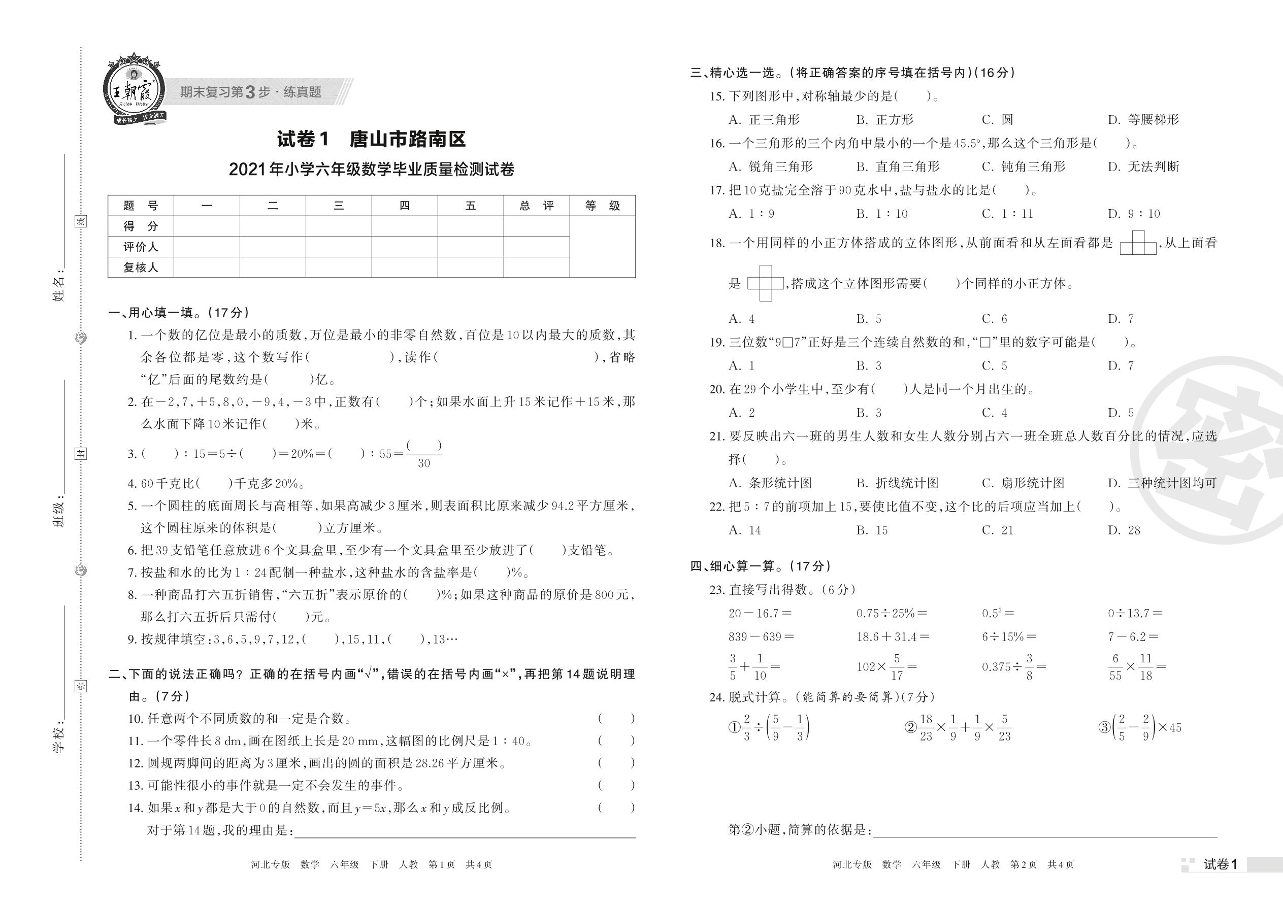 唐山市路南区2021年小学六年级数学毕业质量检测试卷(人教版)【1】