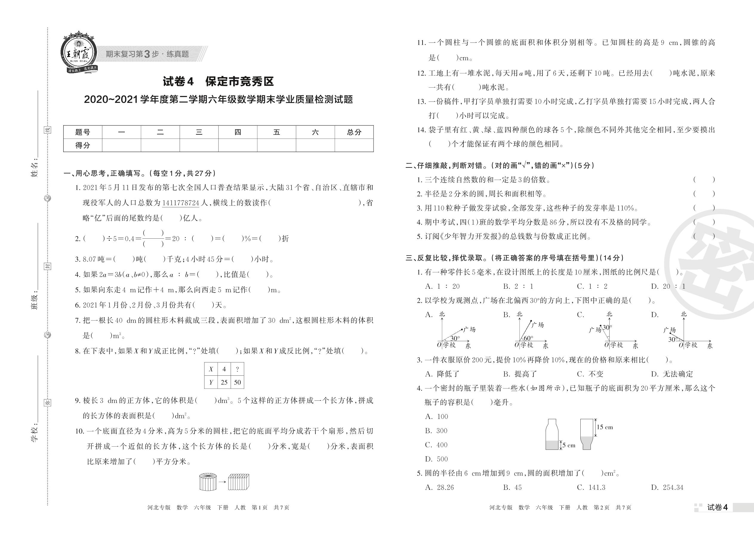 保定市竞秀区2020~2021学年度第二学期六年级数学期末学业质量检测试题(人教版)【4】