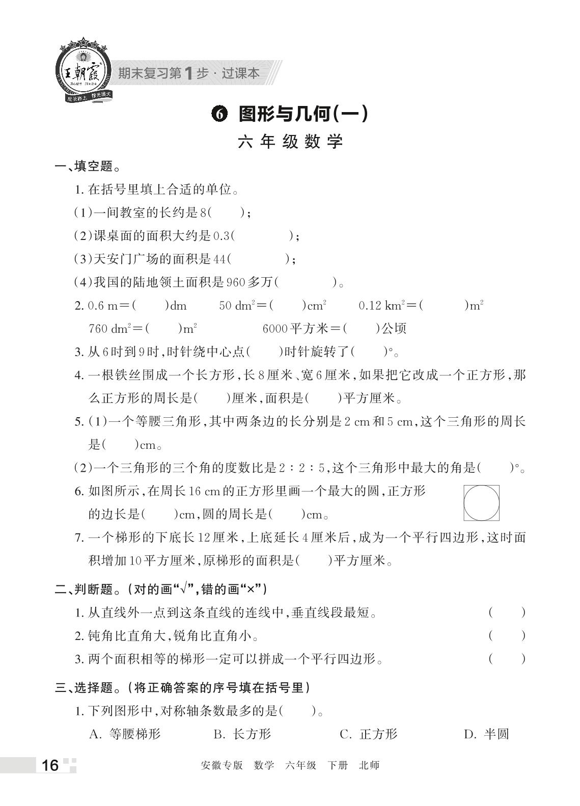 王朝霞期末过课本——6 图形与几何(一)六年级下册数学(北师版)