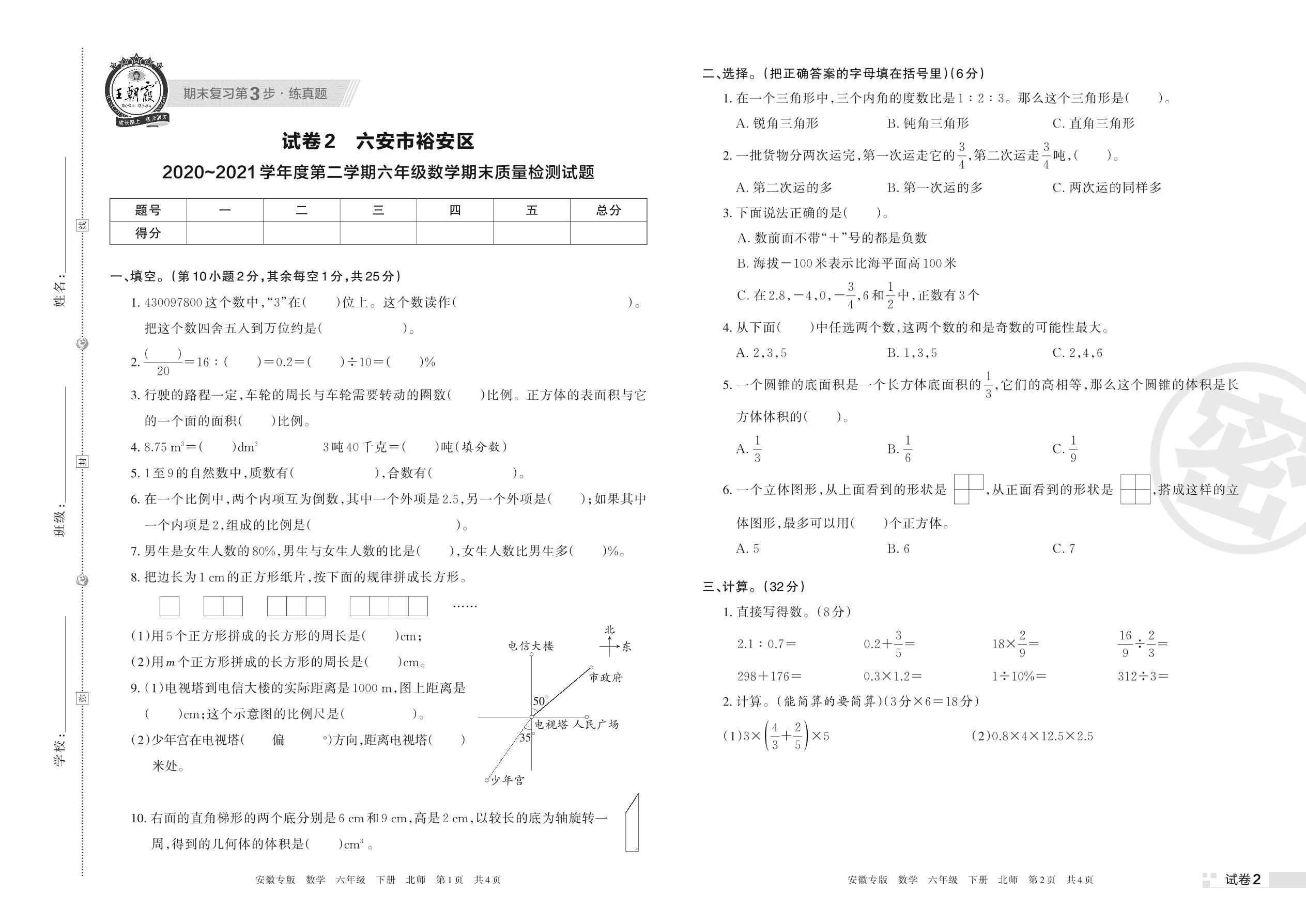 六安市裕安区2020~2021学年度第二学期六年级数学期末质量检测试题(北师版)【2】