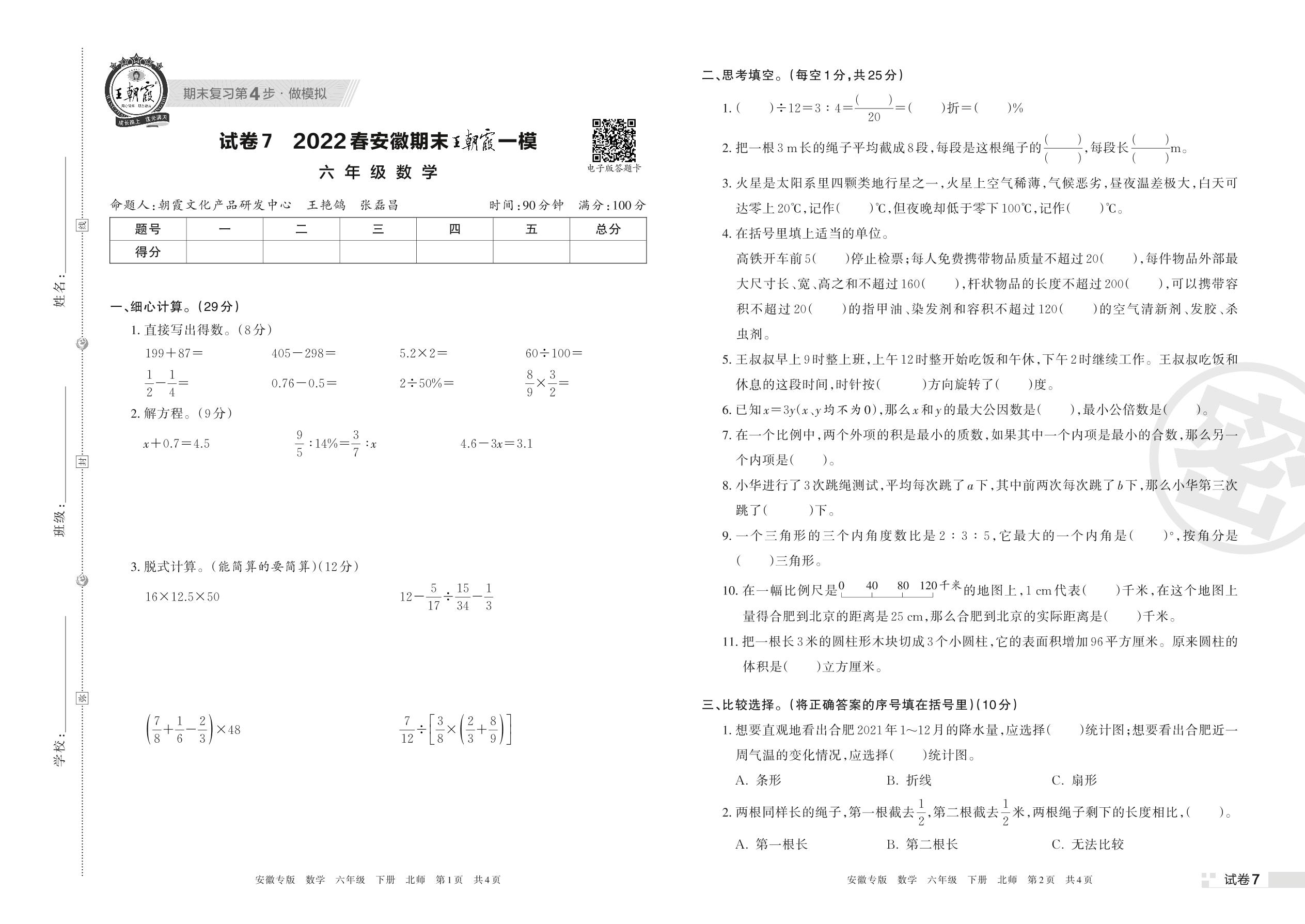 王朝霞期末模拟卷六年级下册数学(北师版)【7】