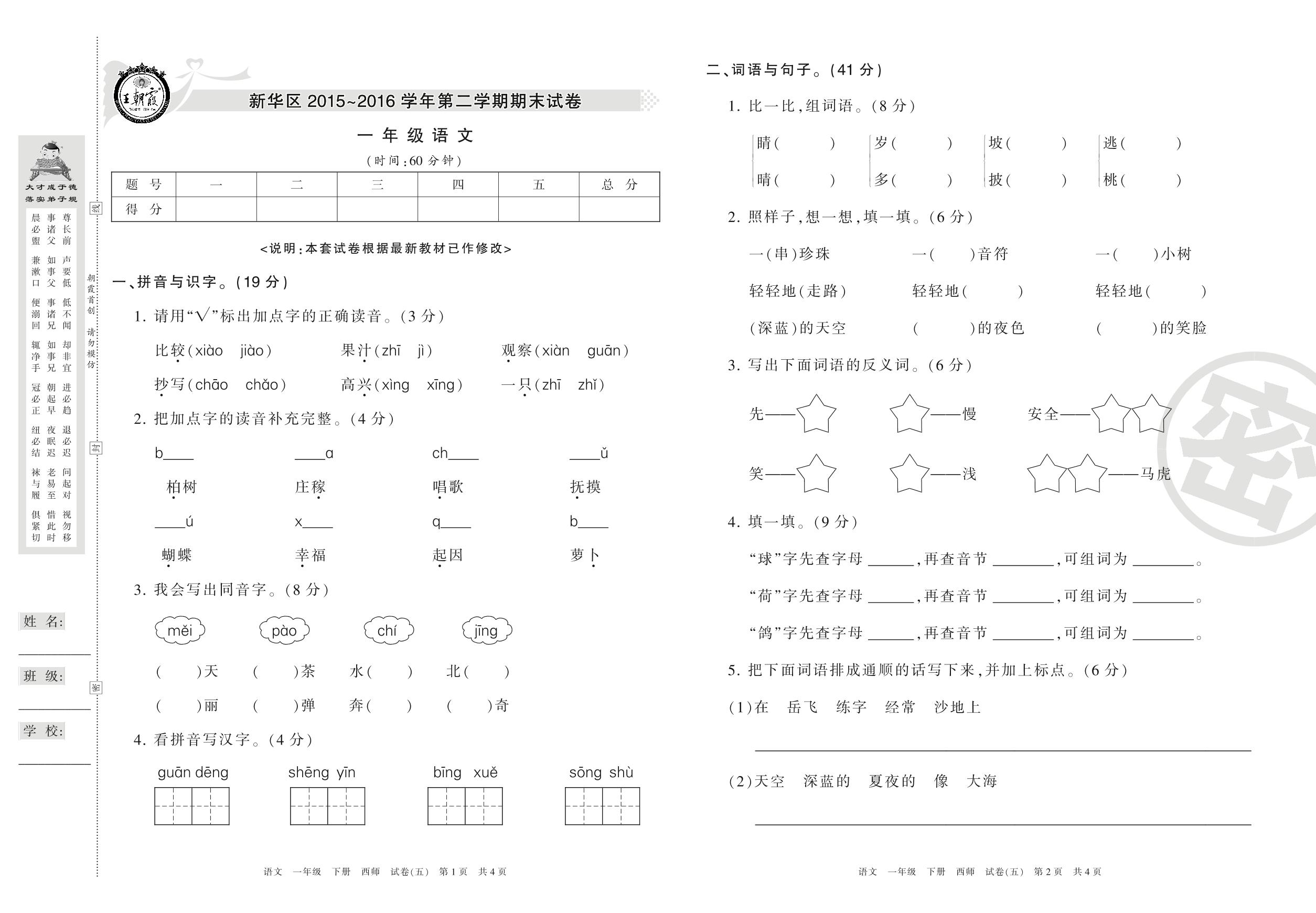 2015-2016学年第二学期平顶山市新华区一年级语文试卷(西师版)【5】