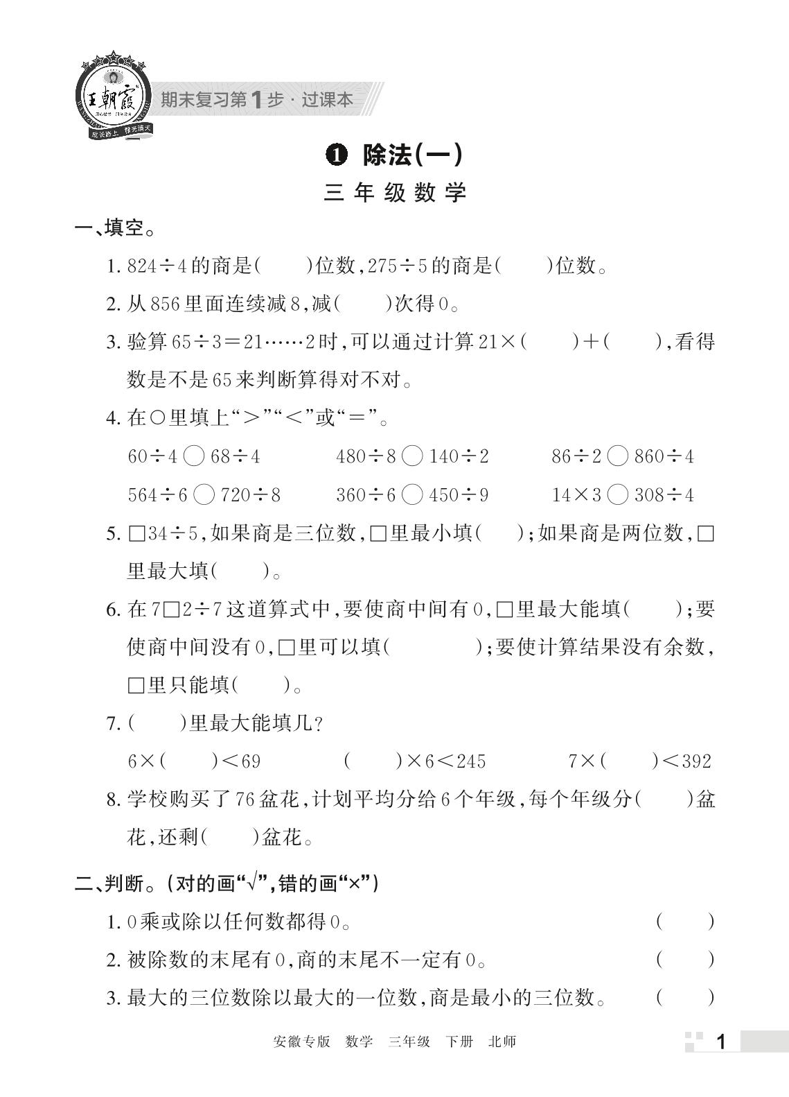 王朝霞期末过课本——1 除法(一)三年级下册数学(北师版)