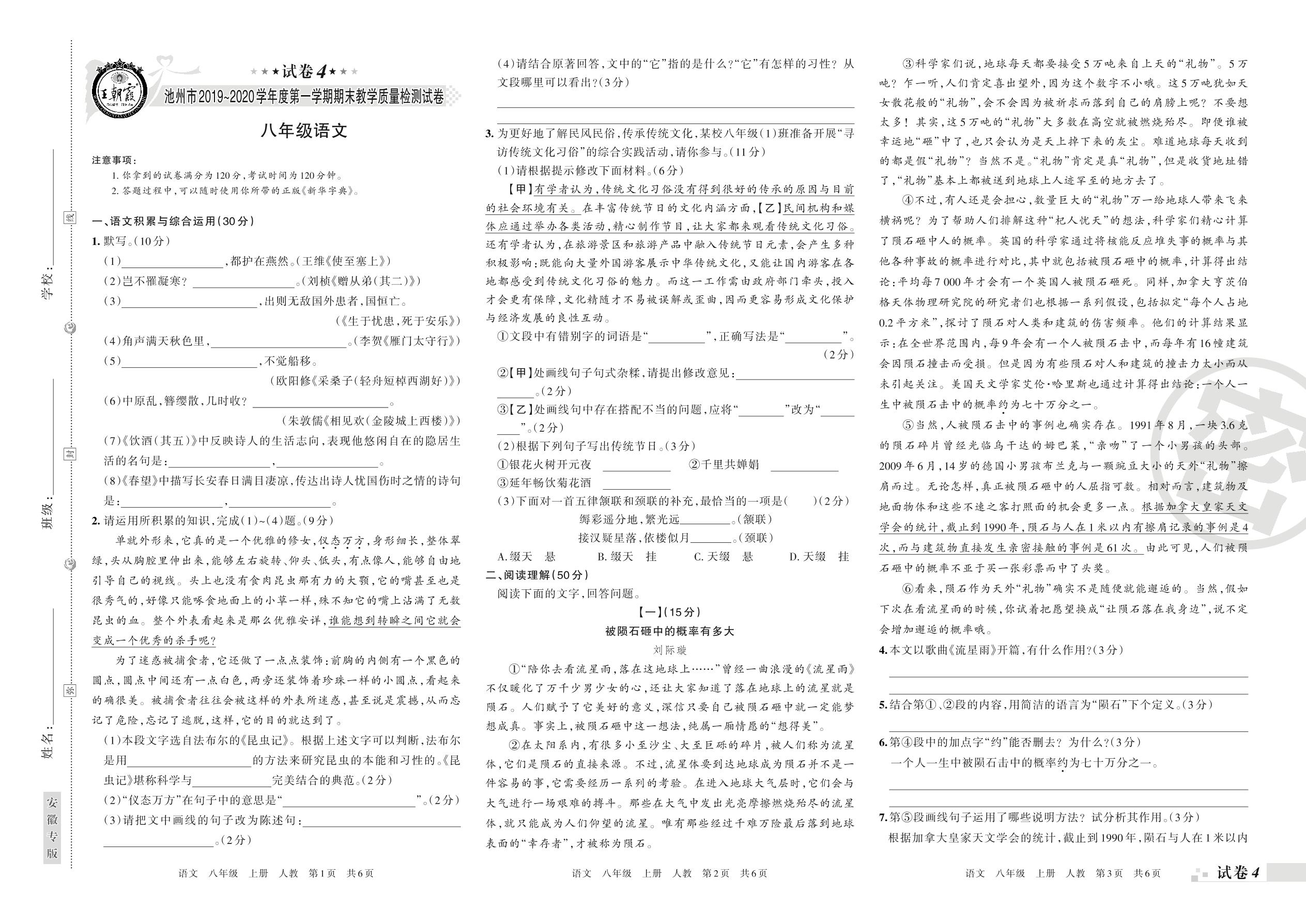 2019-2020学年第一学期池州市八年级语文试卷(人教版)【4】