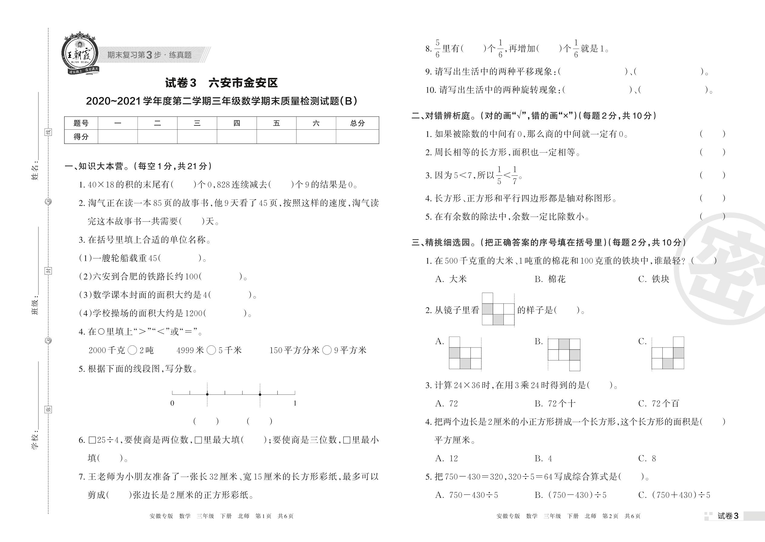 六安市金安区2020~2021学年度第二学期三年级数学期末质量检测试题(B)(北师版)【3】