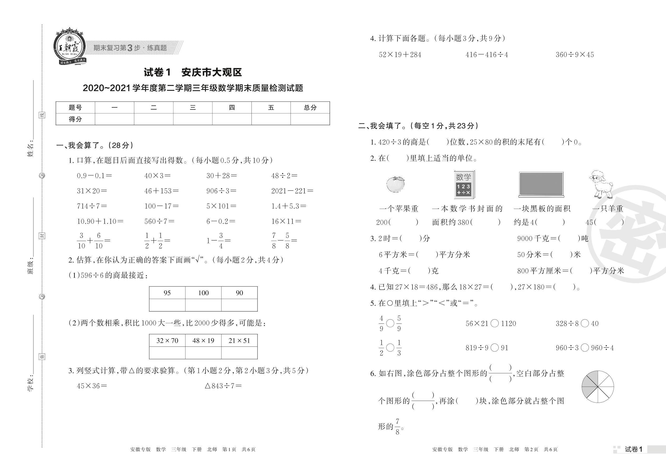 安庆市大观区2020~2021学年度第二学期三年级数学期末质量检测试题(北师版)【1】