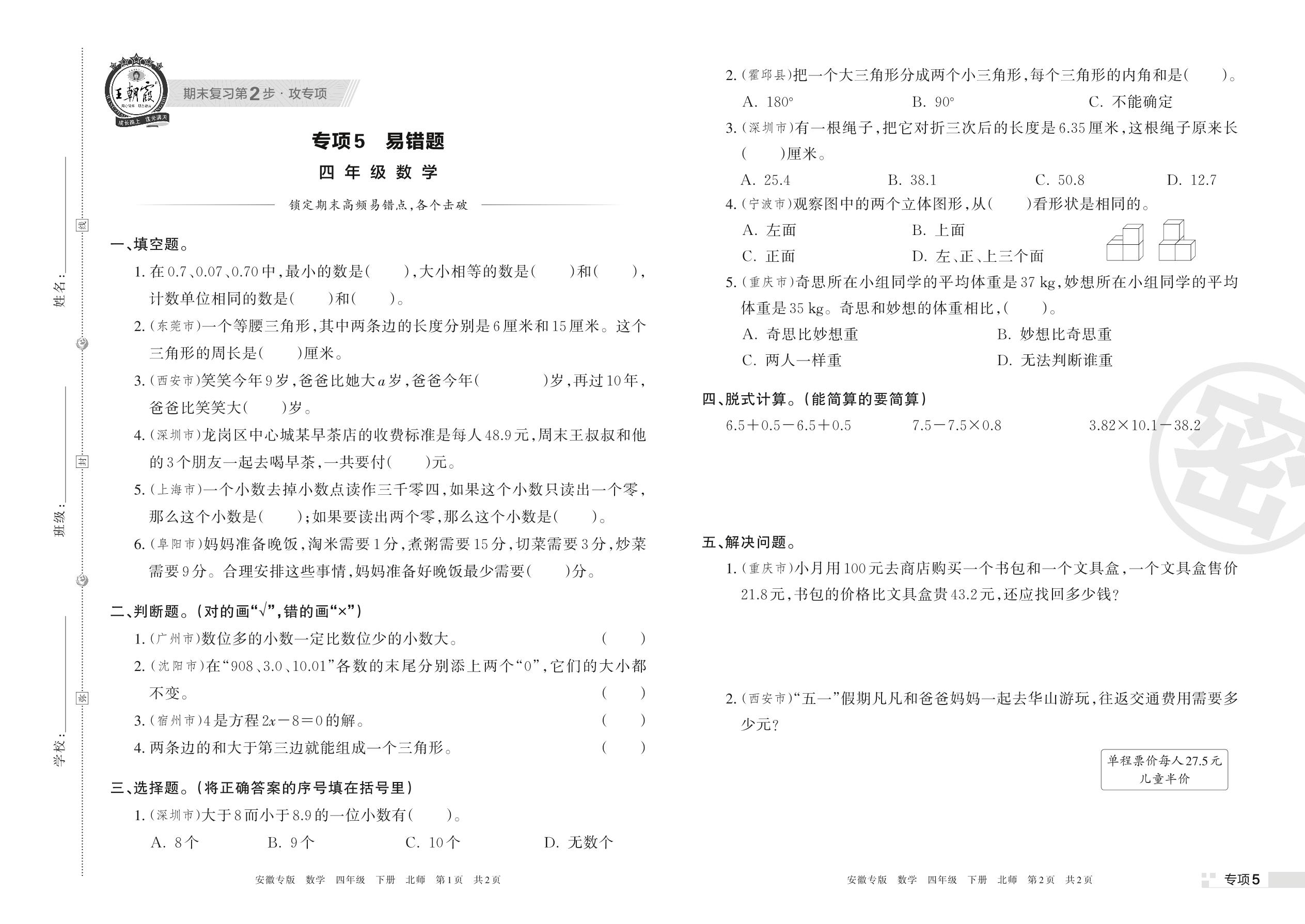 王朝霞期末专项卷——易错题四年级下册数学(北师版)【5】
