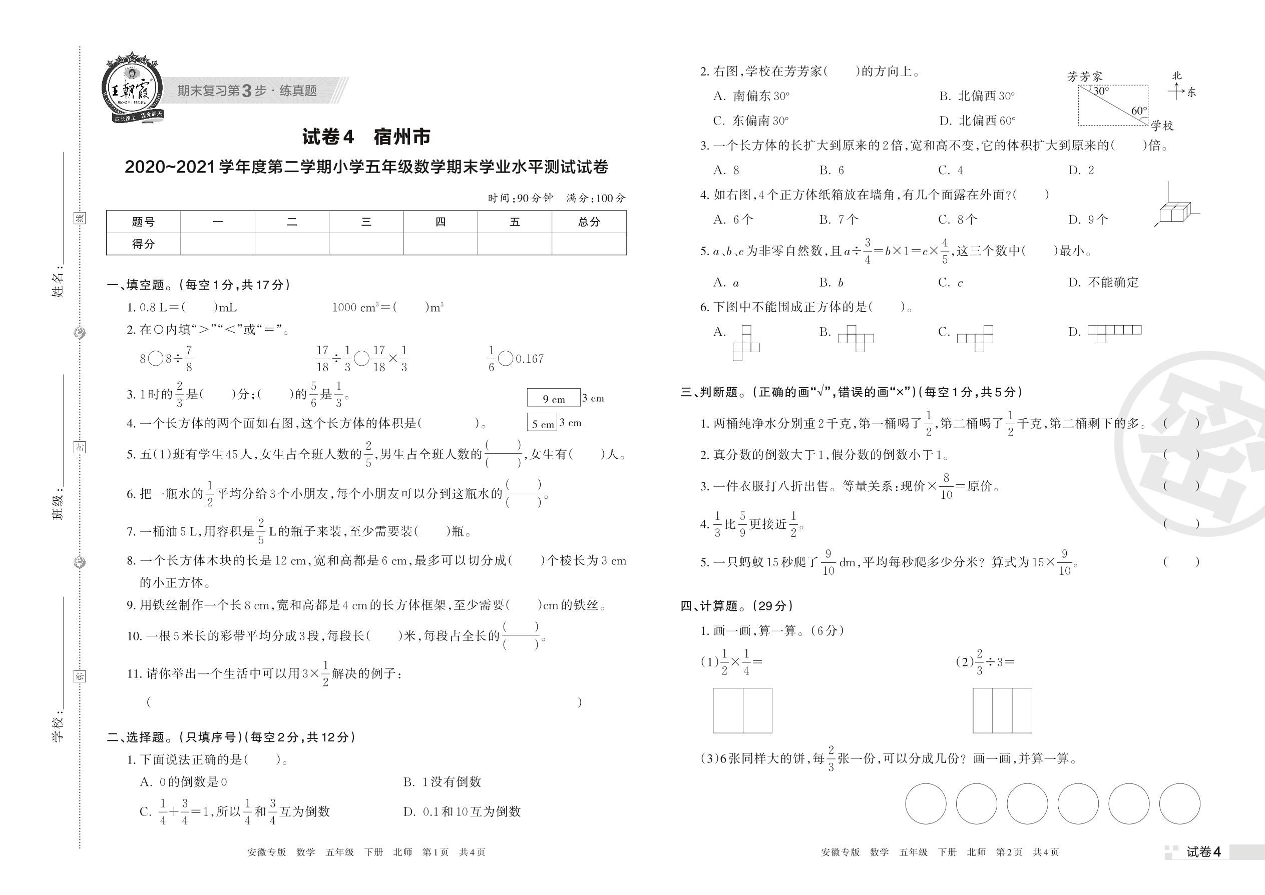 宿州市2020~2021学年度第二学期小学五年级数学期末学业水平测试试卷(北师版)【4】