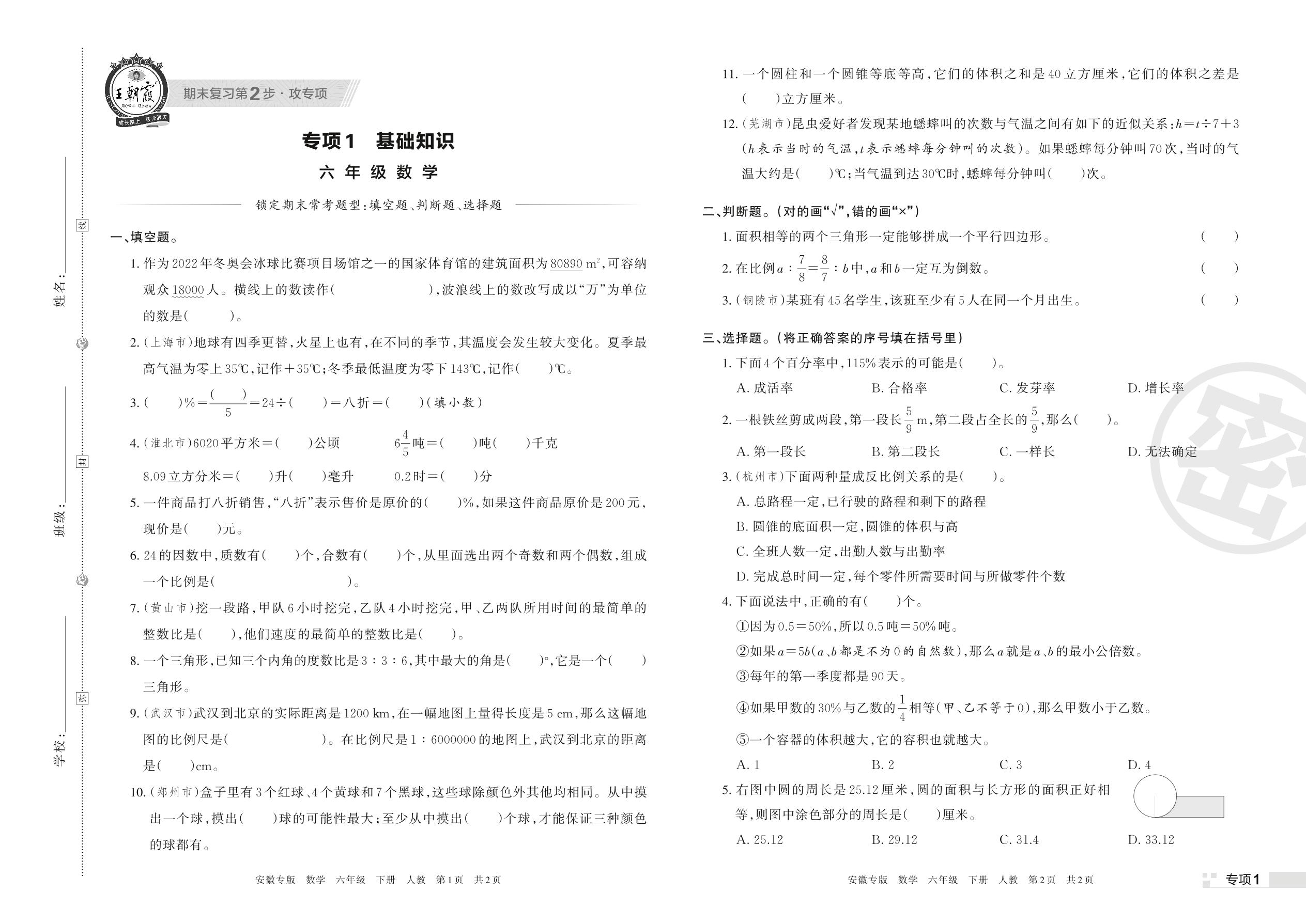 王朝霞期末专项卷——基础知识六年级下册数学(人教版)_R220326142338651【1】
