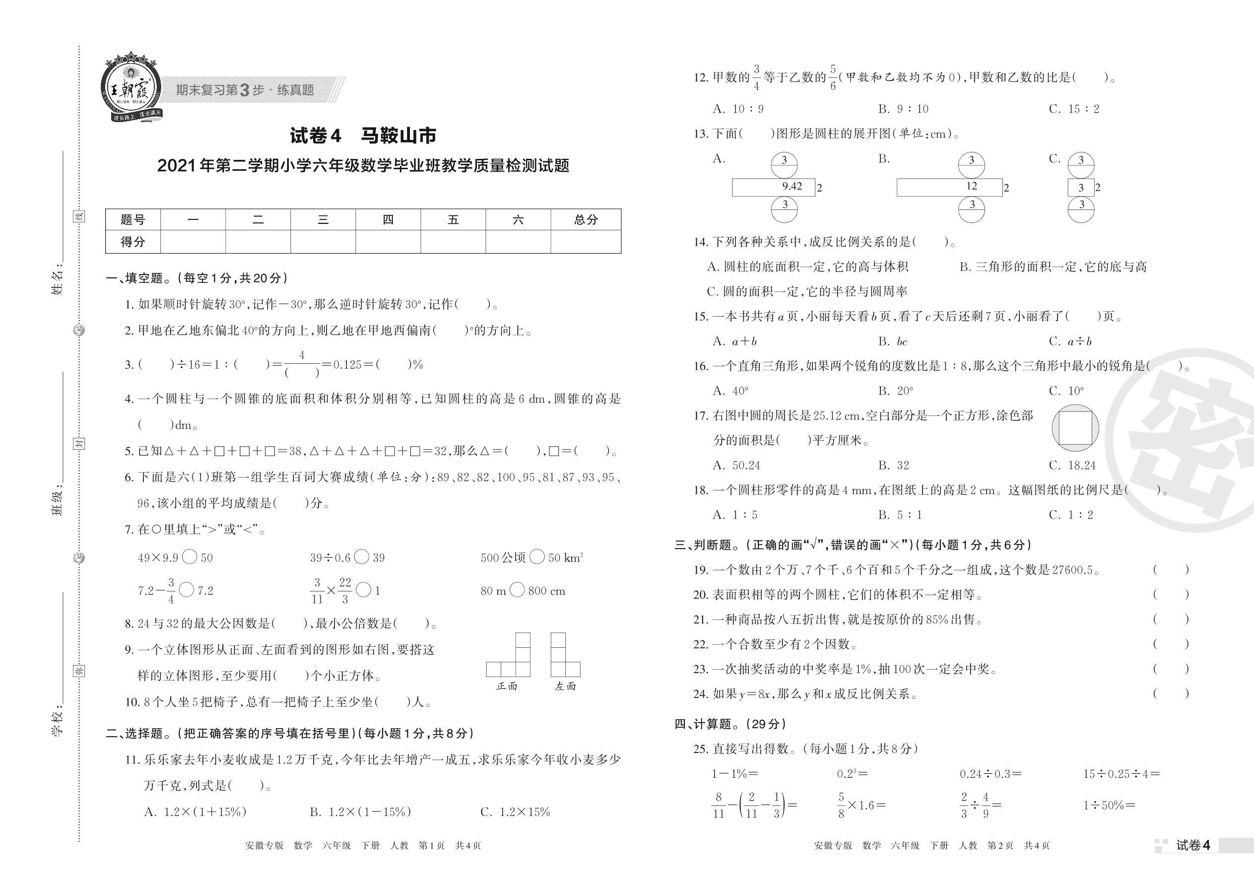马鞍山市2021年第二学期小学六年级数学毕业班教学质量检测试题(人教版)【4】