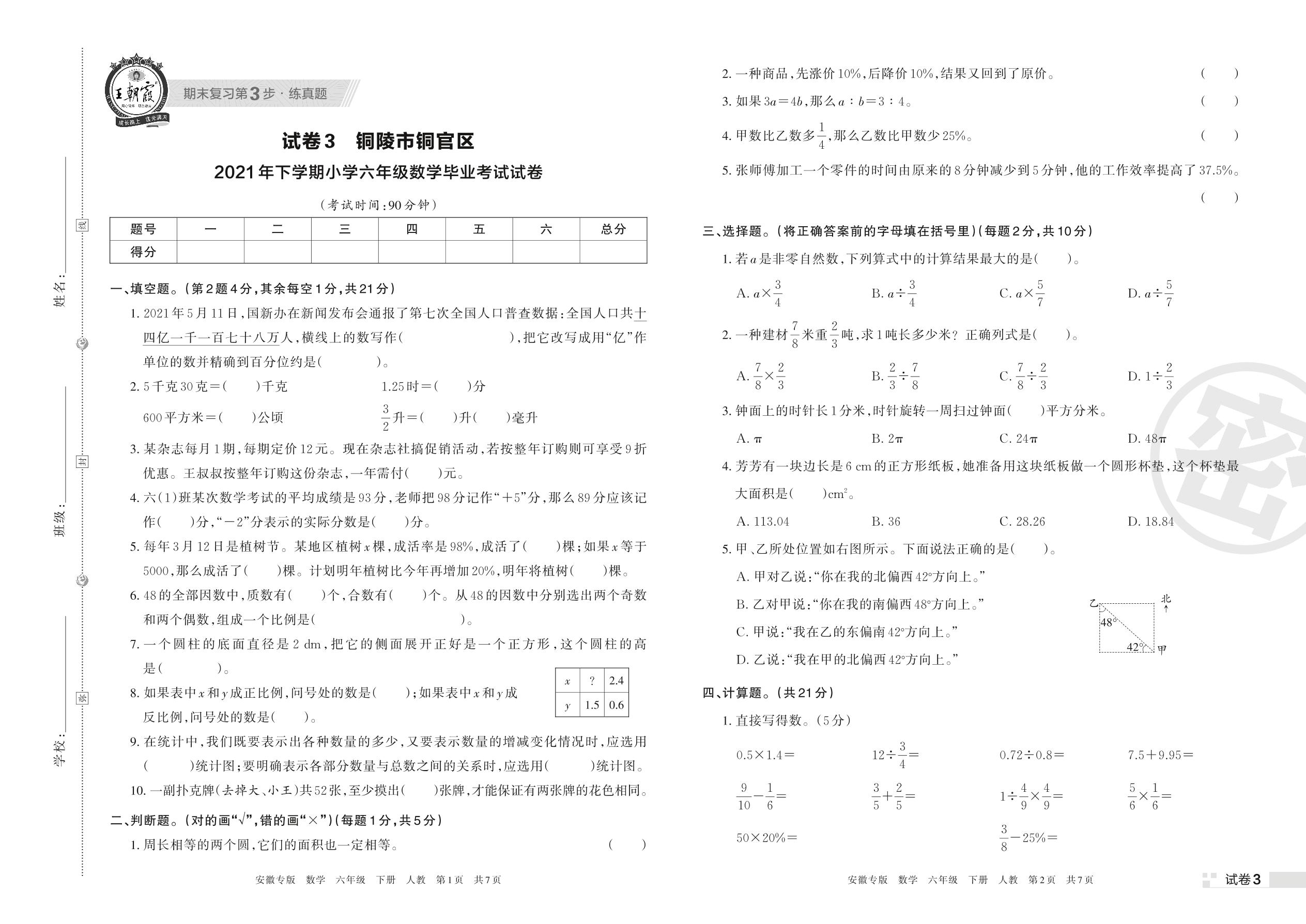 铜陵市铜官区2021年下学期小学六年级数学毕业考试试卷(人教版)【3】