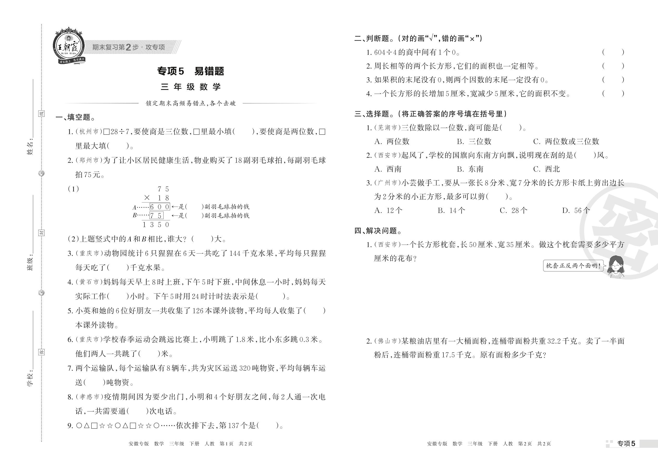 王朝霞期末专项卷——易错题三年级下册数学(人教版)_R220326144111346【5】