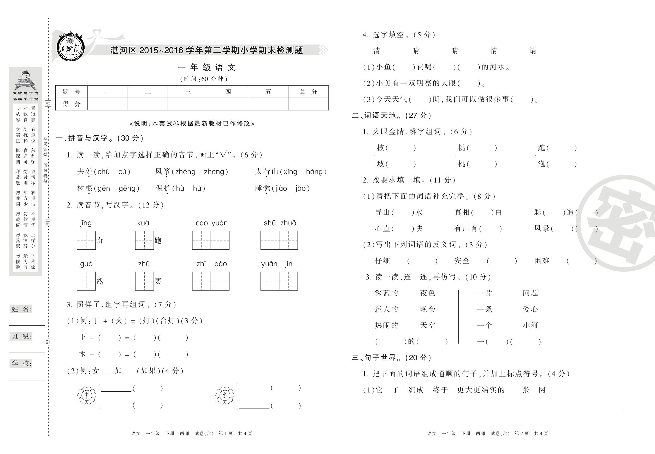2015-2016学年第二学期平顶山市湛河区一年级语文试卷(西师版)【6】