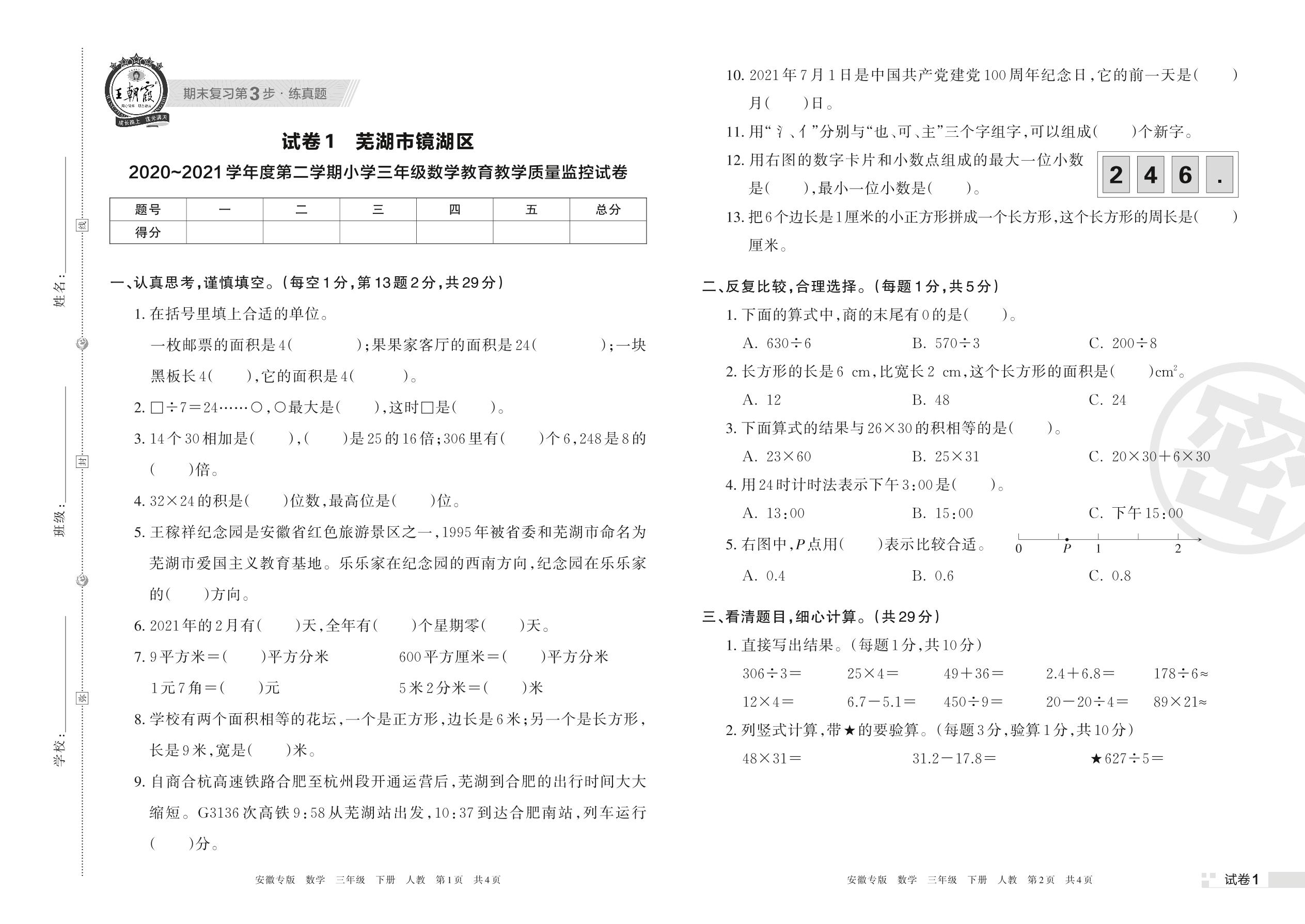 芜湖市镜湖区2020~2021学年度第二学期小学三年级数学教育教学质量监控试卷(人教版)【1】