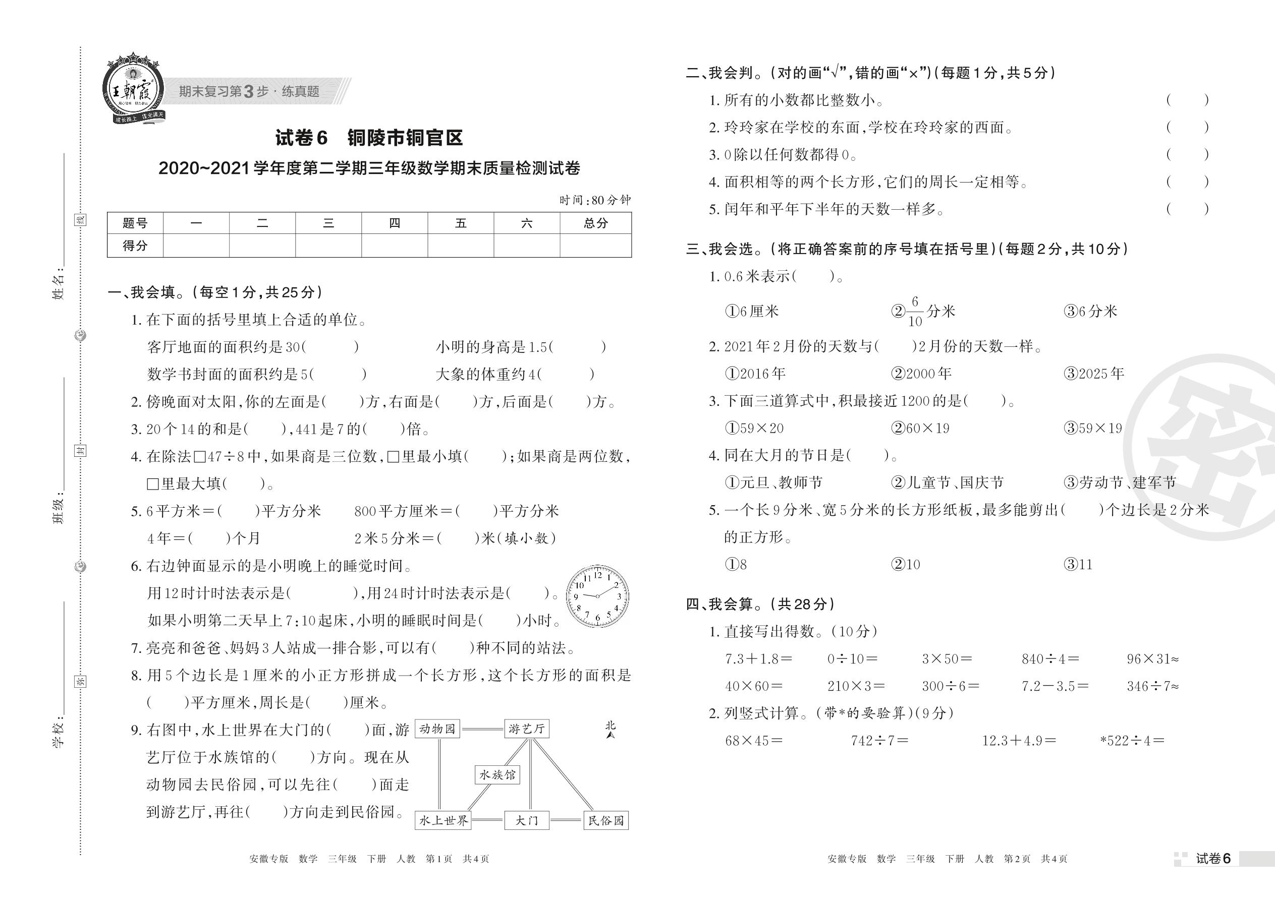 铜陵市铜官区2020~2021学年度第二学期三年级数学期末质量检测试卷(人教版)【6】