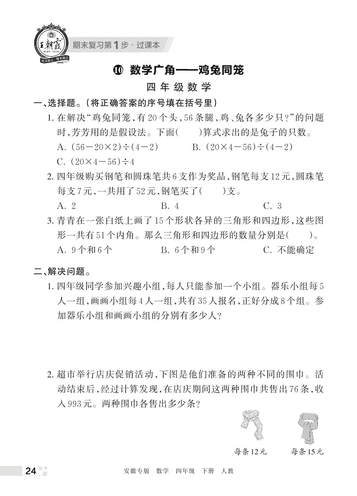 王朝霞期末过课本——10 数学广角:鸡兔同笼四年级下册数学(人教版)