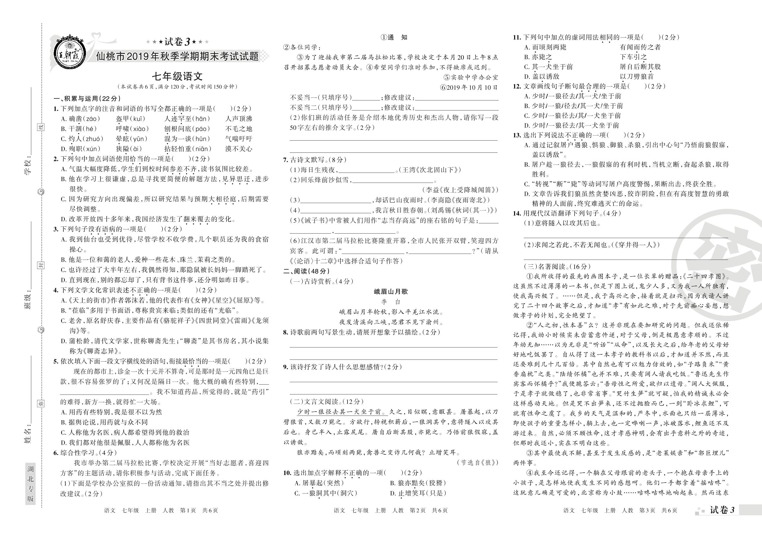 2019-2020学年第一学期仙桃市七年级语文试卷(人教版)【3】