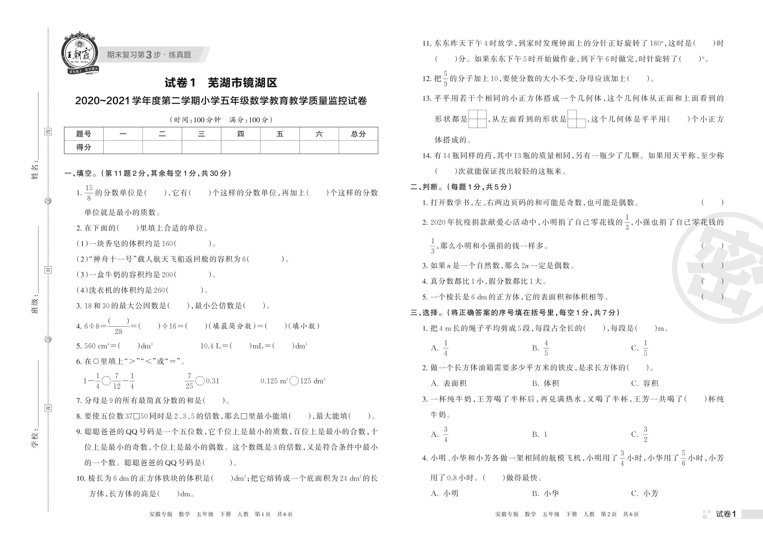 芜湖市镜湖区2020~2021学年度第二学期小学五年级数学教育教学质量监控试卷(人教版)【1】
