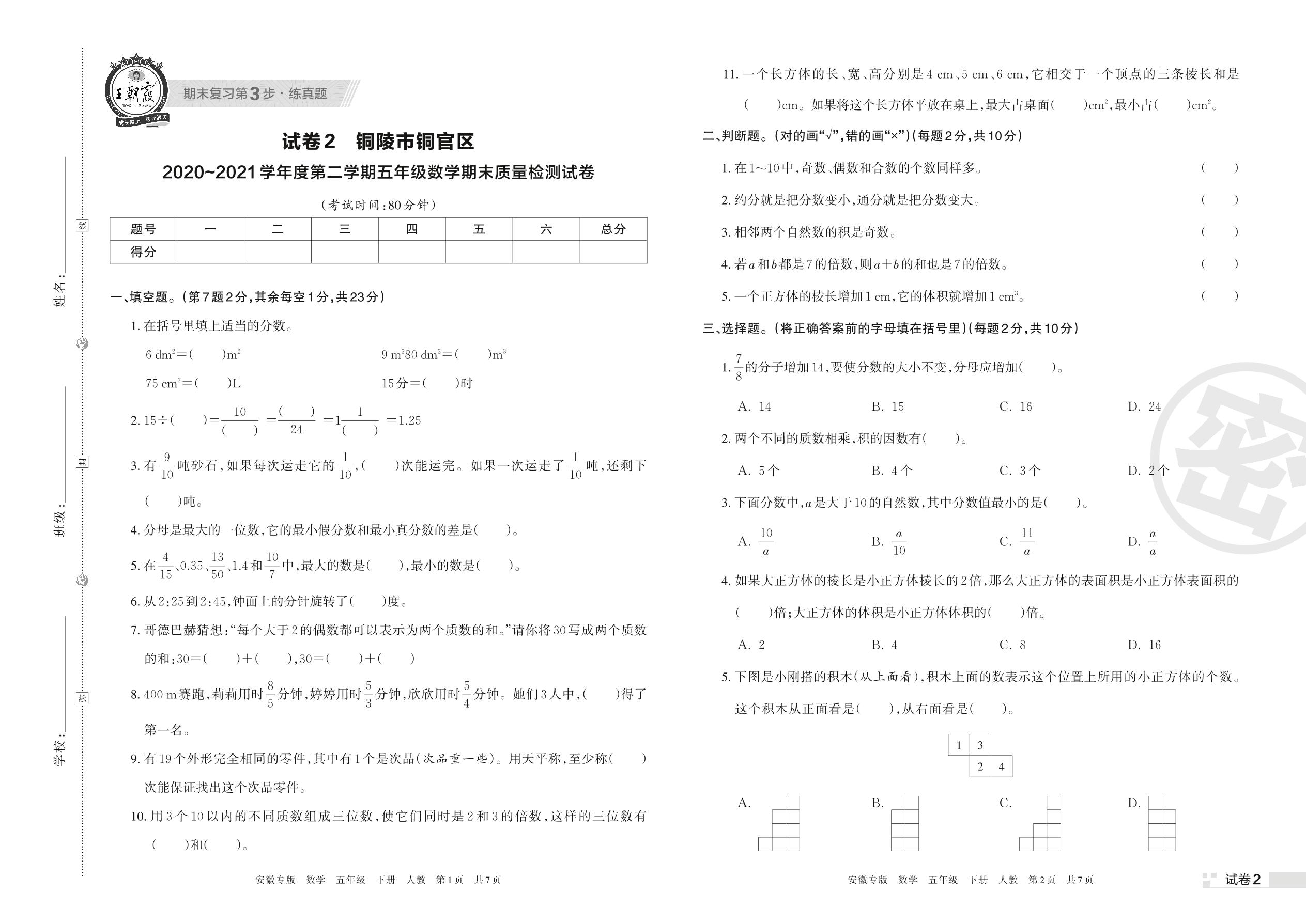 铜陵市铜官区2020~2021学年度第二学期五年级数学期末质量检测试卷(人教版)【2】
