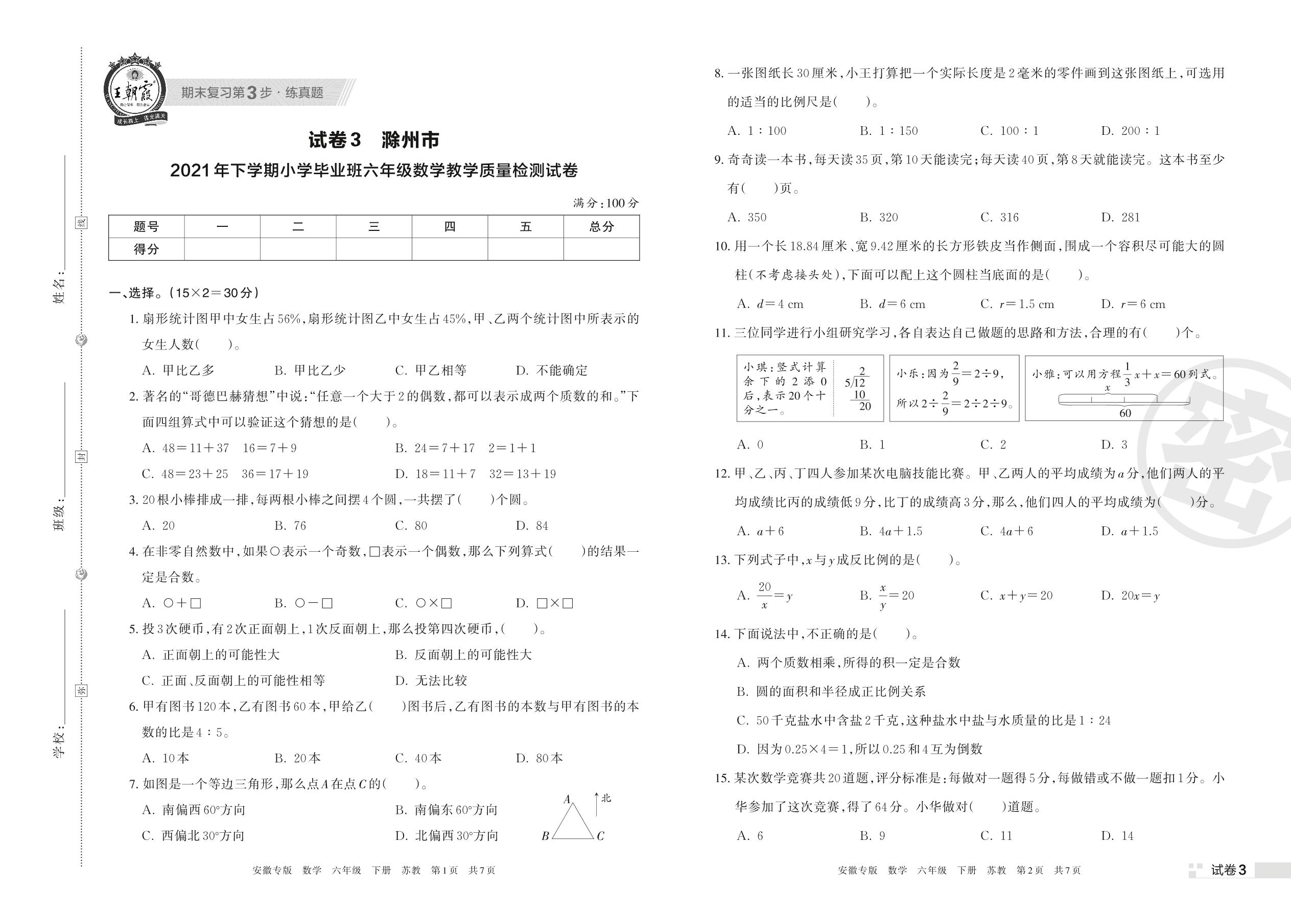 滁州市2021年下学期小学毕业班六年级数学教学质量检测试卷(苏教版)【3】