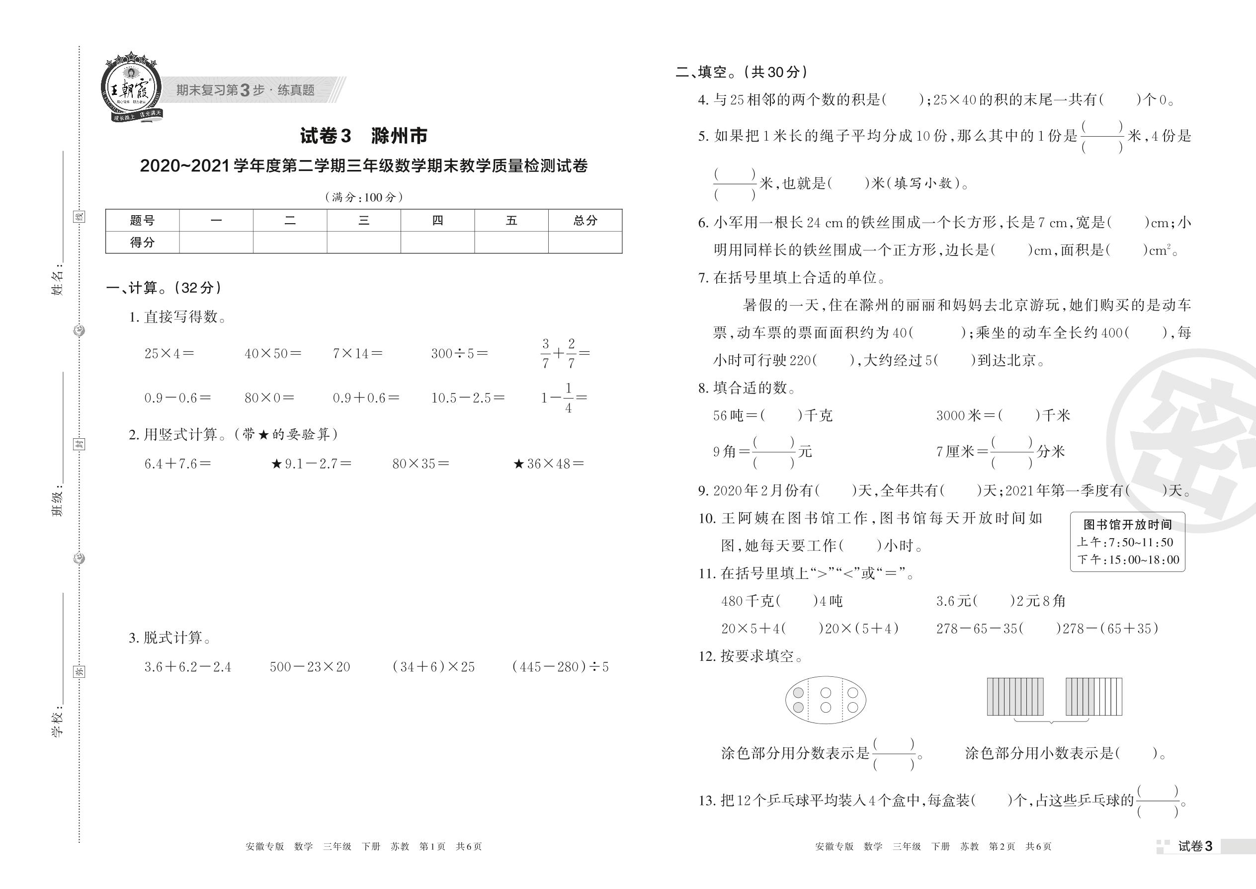滁州市2020~2021学年度第二学期三年级数学期末教学质量检测试卷(苏教版)【3】