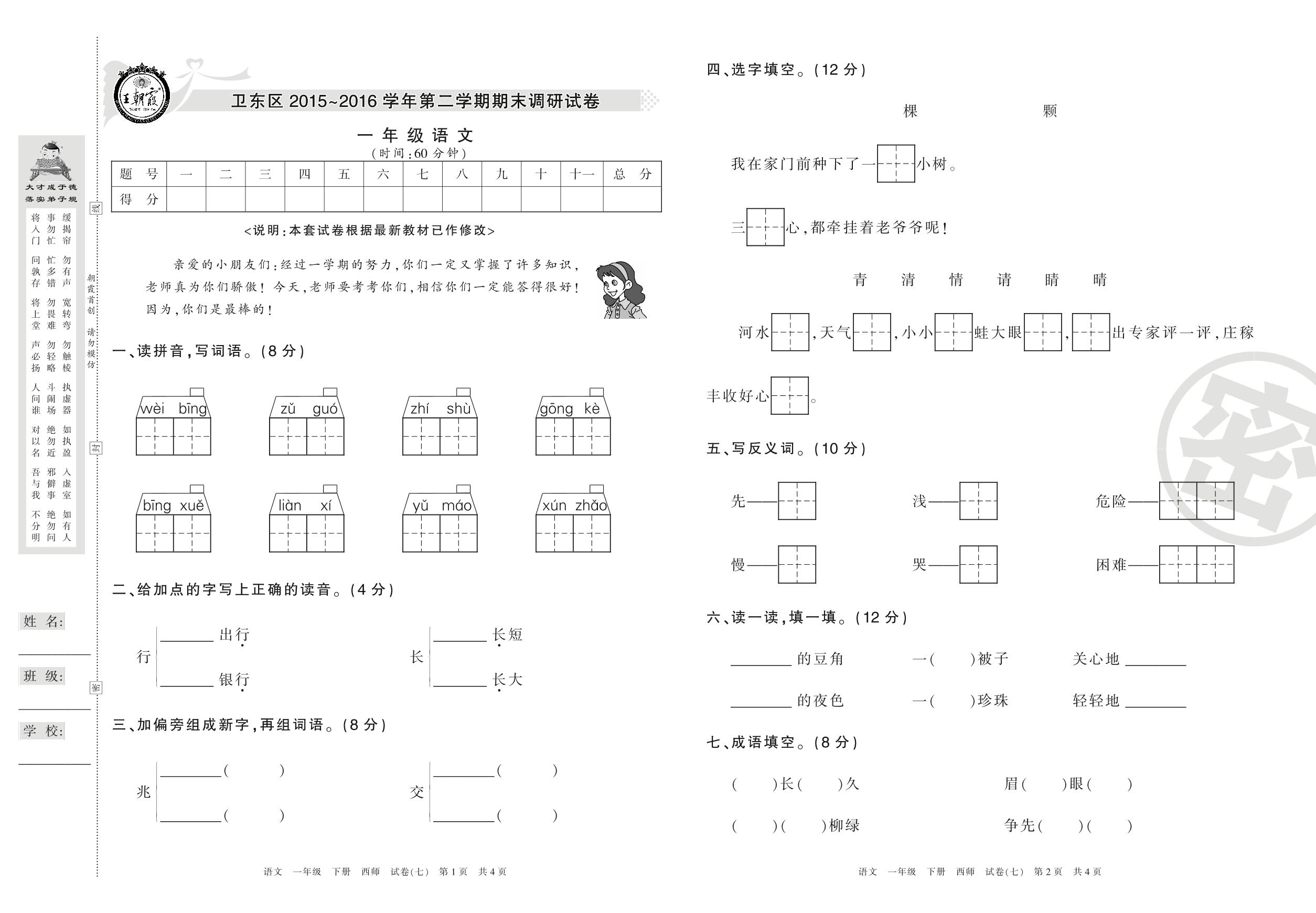 2015-2016学年第二学期平顶山市卫东区一年级语文试卷(西师版)【7】