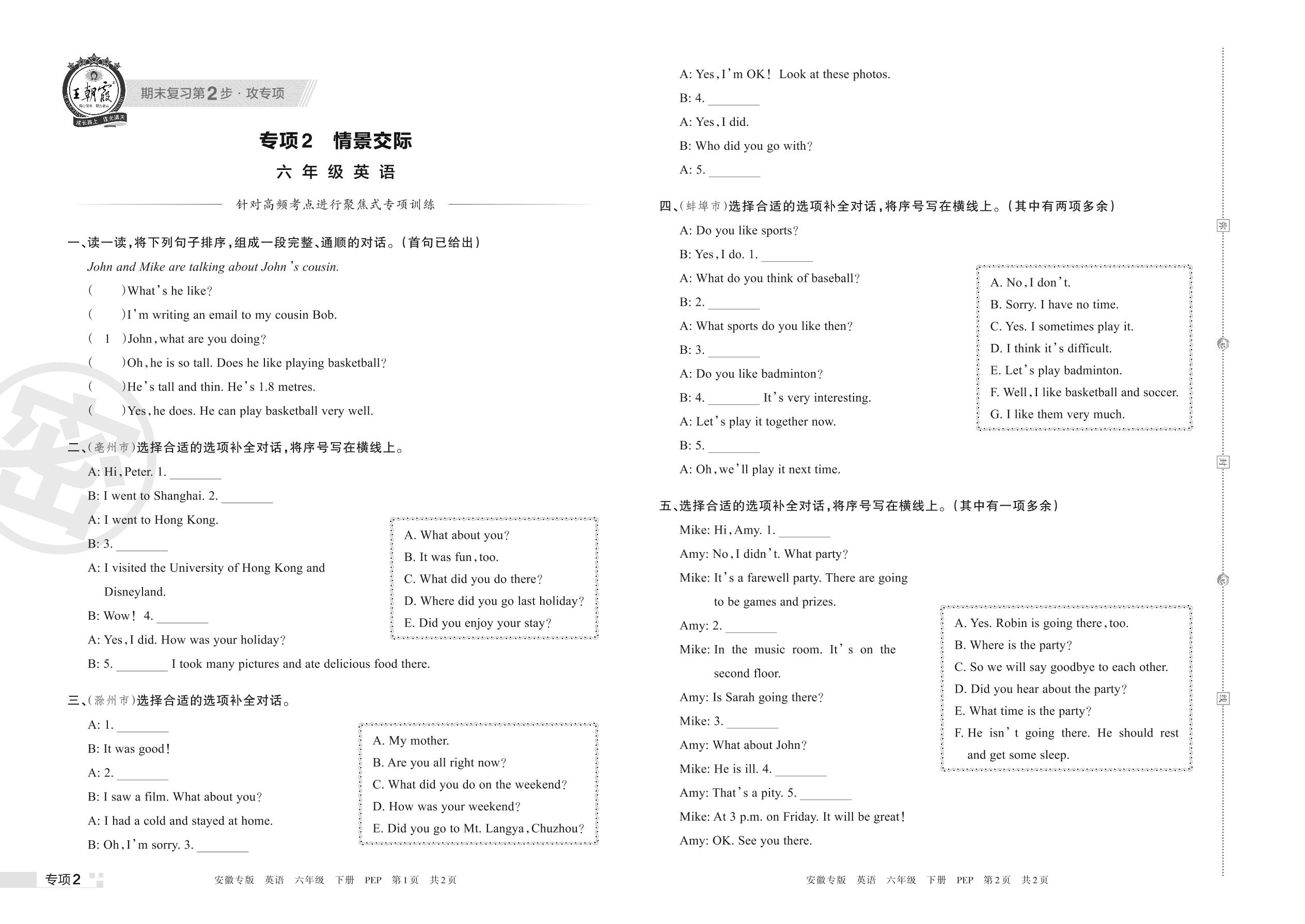 王朝霞期末专项卷——情景交际六年级下册英语(PEP版)【2】