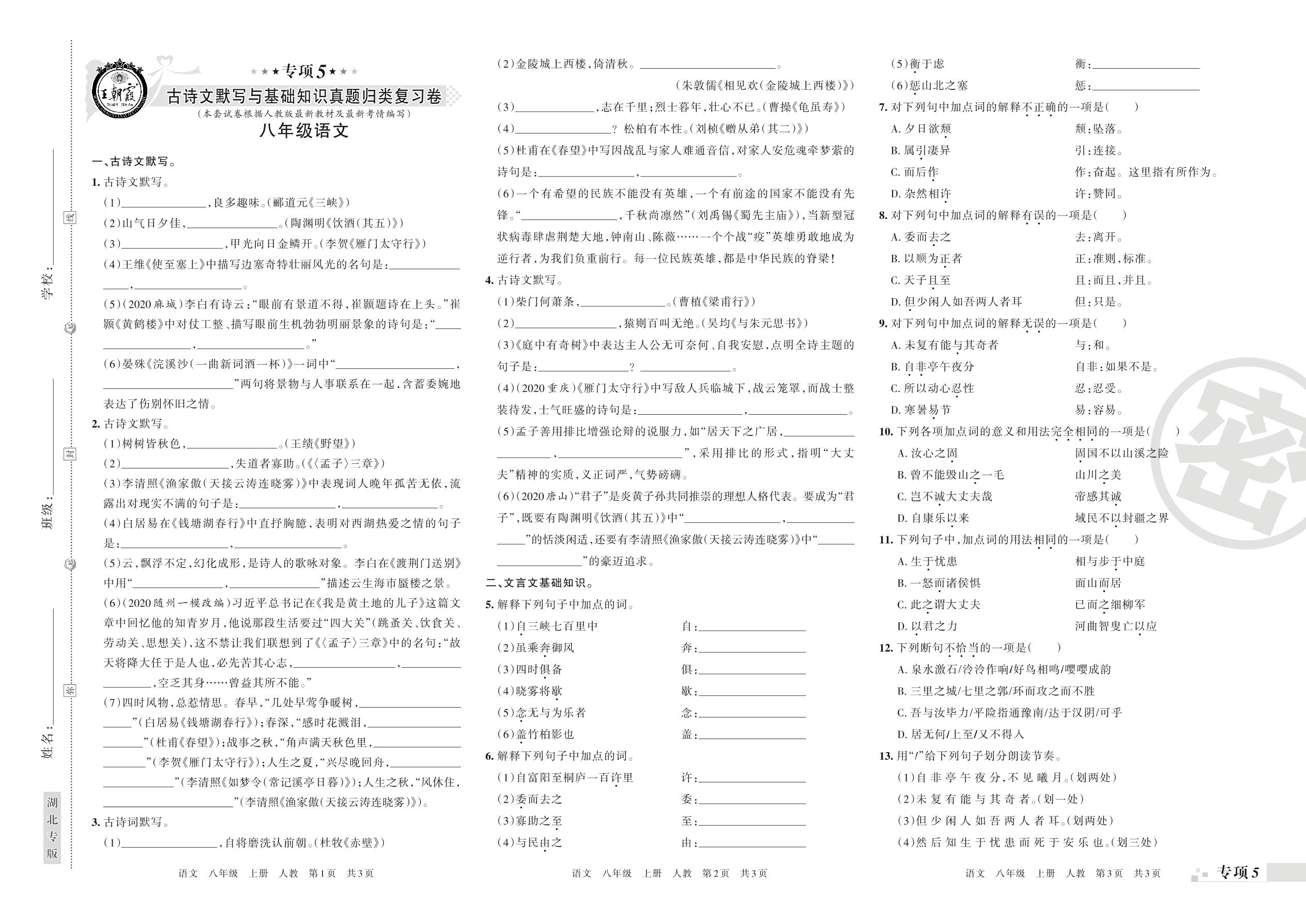 王朝霞期末专项卷——古诗文默写与基础知识、古诗文阅读真题归类复习八年级上册语文(人教版)_R21080213323【0】