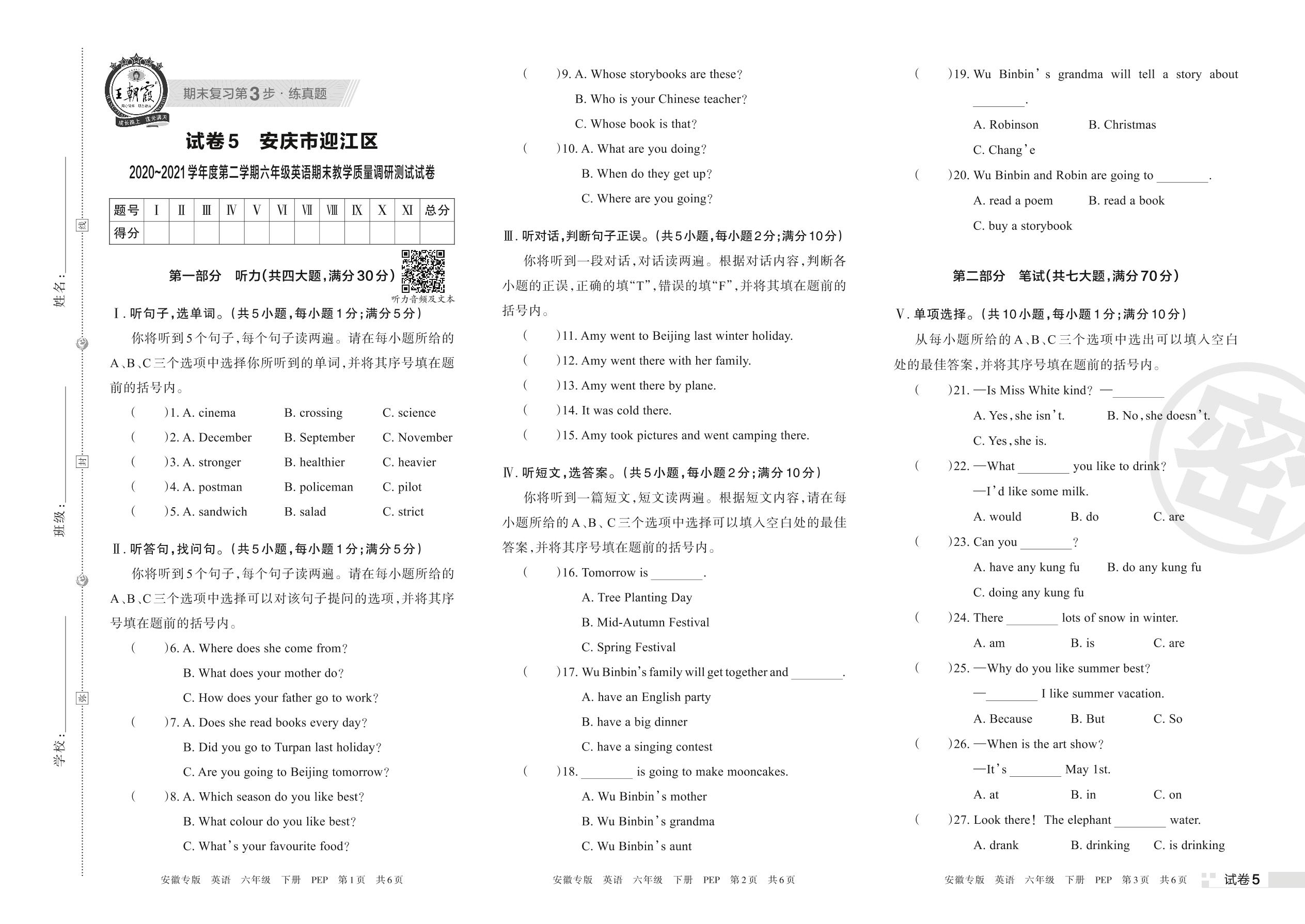 安庆市迎江区2020~2021学年度第二学期六年级英语期末教学质量调研测试试卷(PEP版)【5】