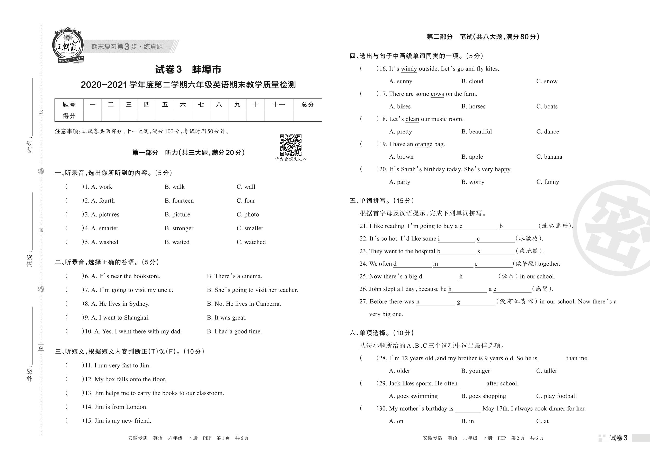 蚌埠市2020~2021学年度第二学期六年级英语期末教学质量检测(PEP版)【3】