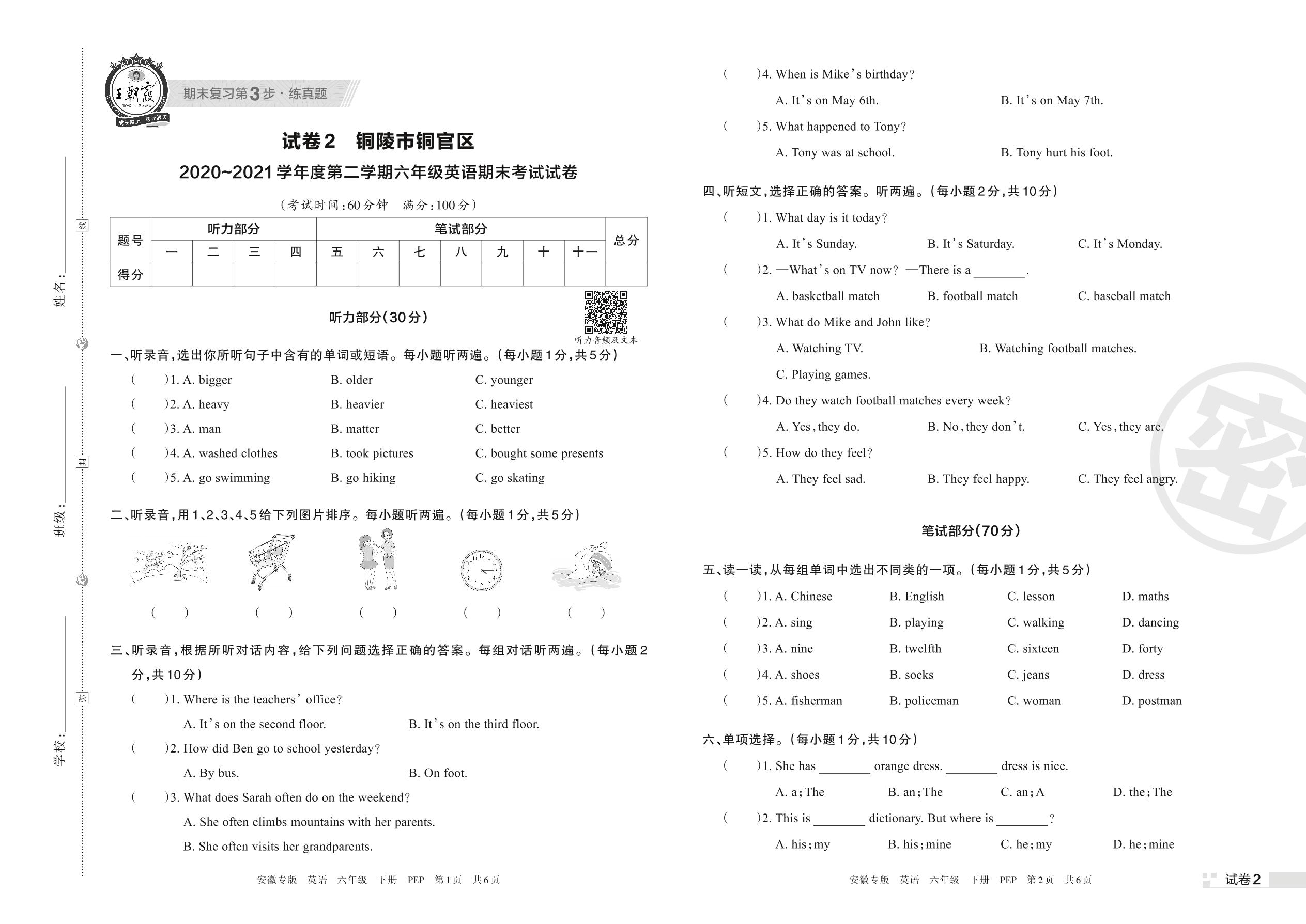 铜陵市铜官区2020~2021学年度第二学期六年级英语期末考试试卷(PEP版)【2】