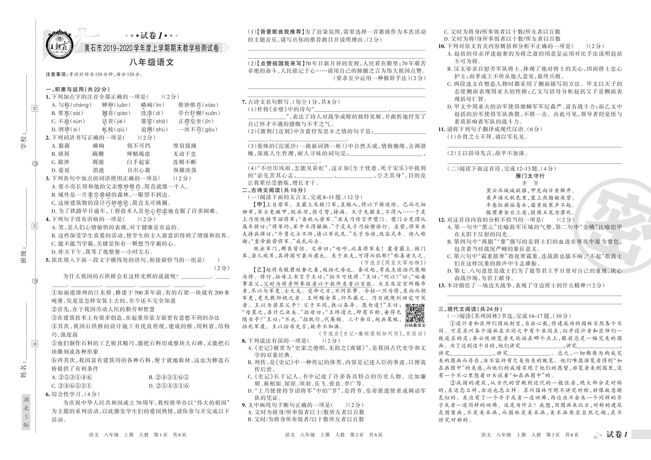 2019-2020学年第一学期黄石市八年级语文试卷(人教版)【1】