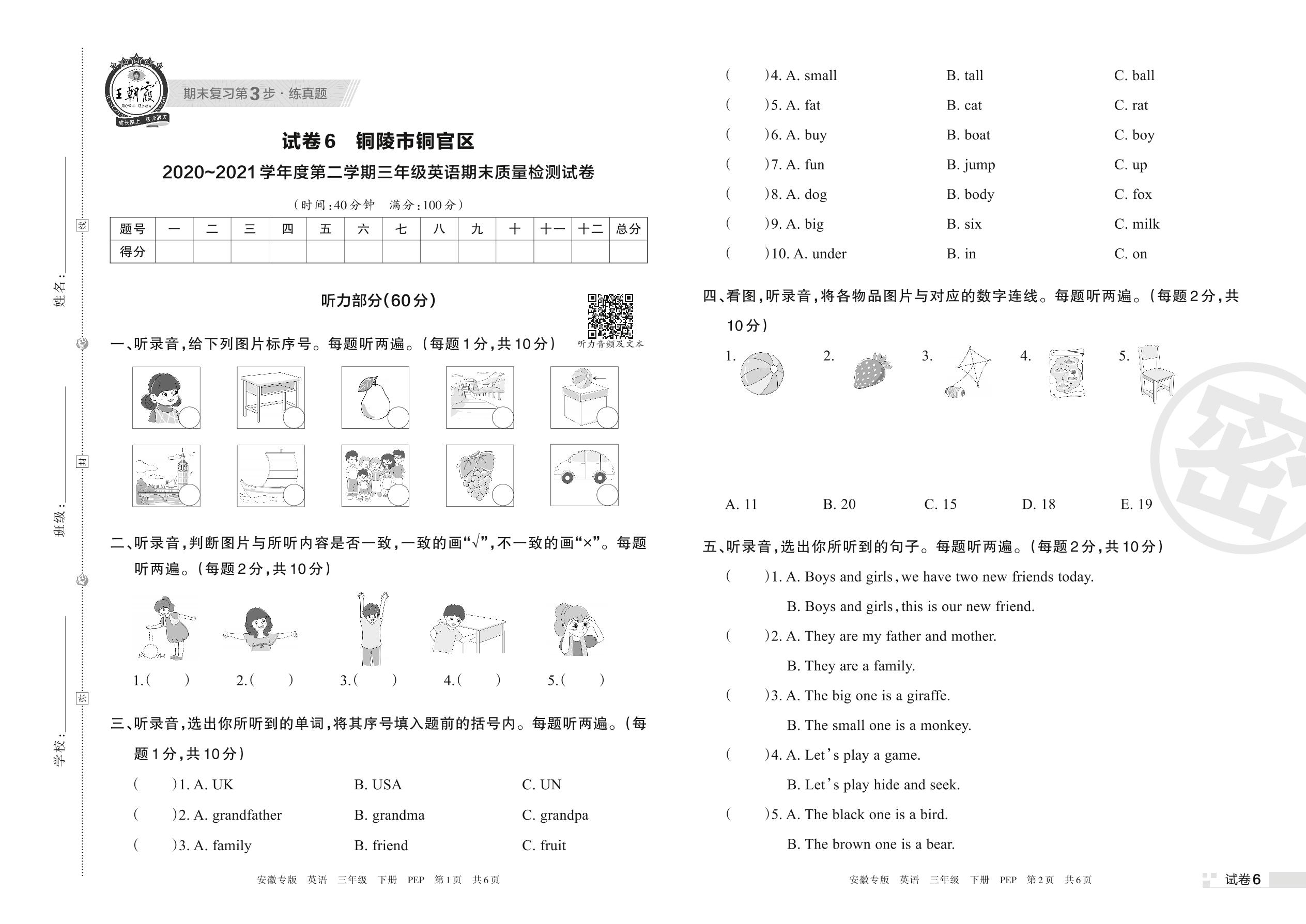 铜陵市铜官区2020~2021学年度第二学期三年级英语期末质量检测试卷(PEP版)【6】