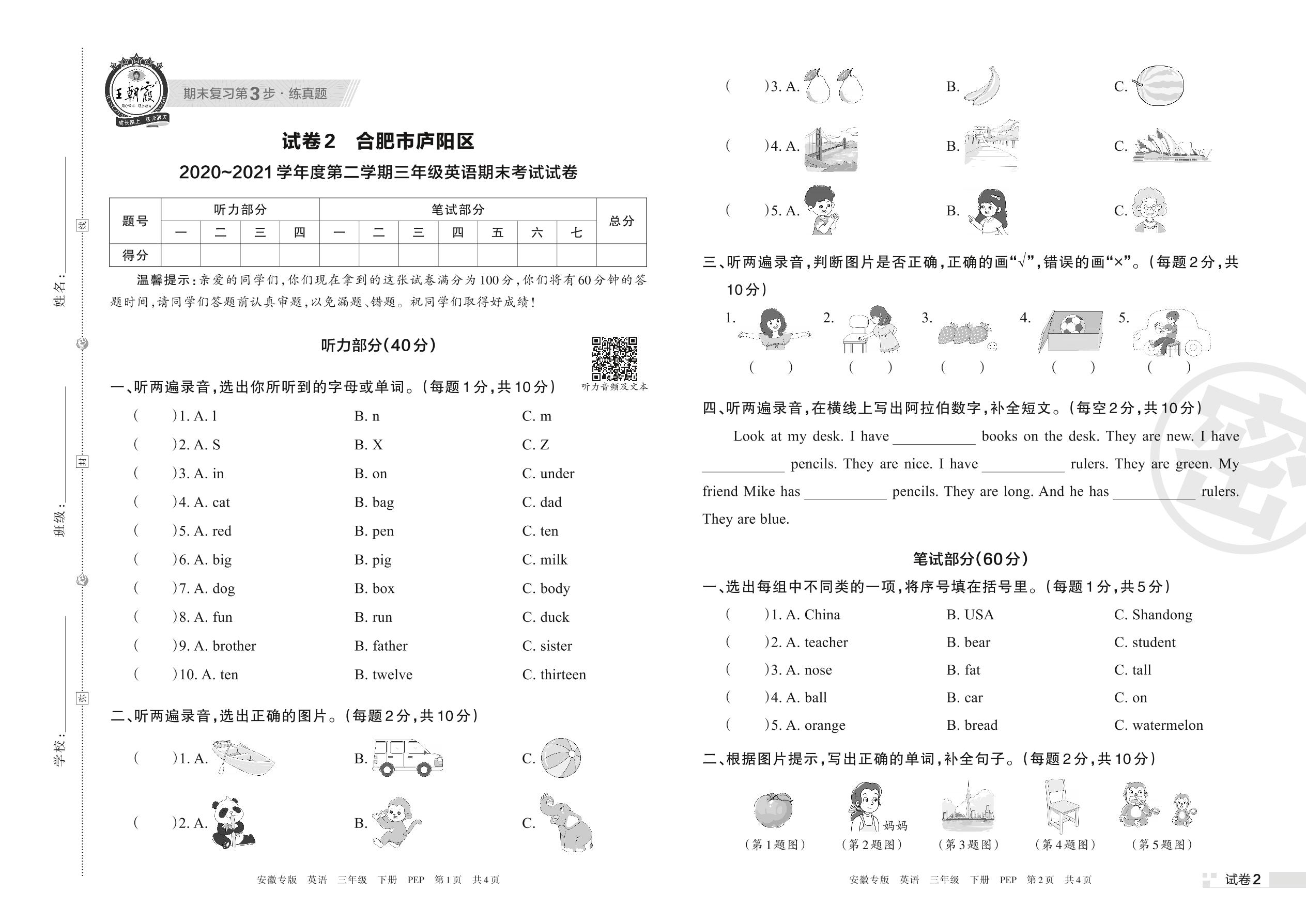 合肥市庐阳区2020~2021学年度第二学期三年级英语期末考试试卷(PEP版)【2】