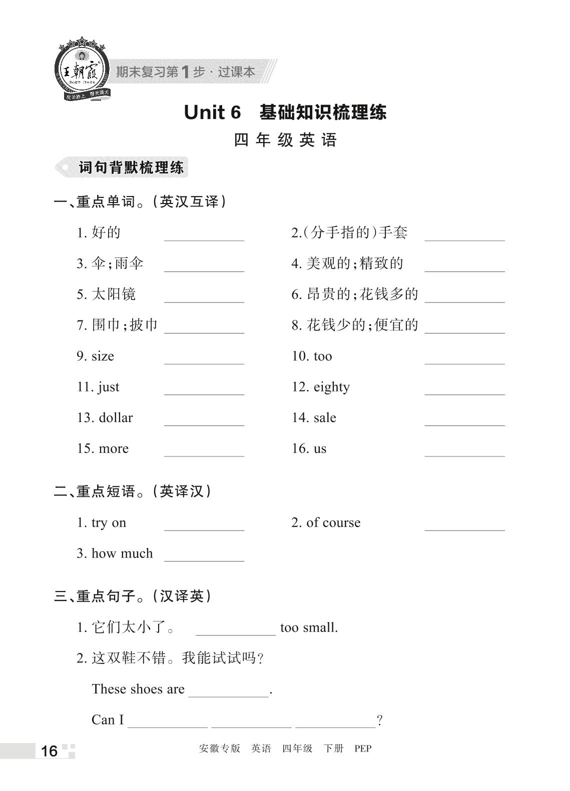 王朝霞期末过课本——Unit 6 基础知识梳理练四年级下册英语(PEP版)